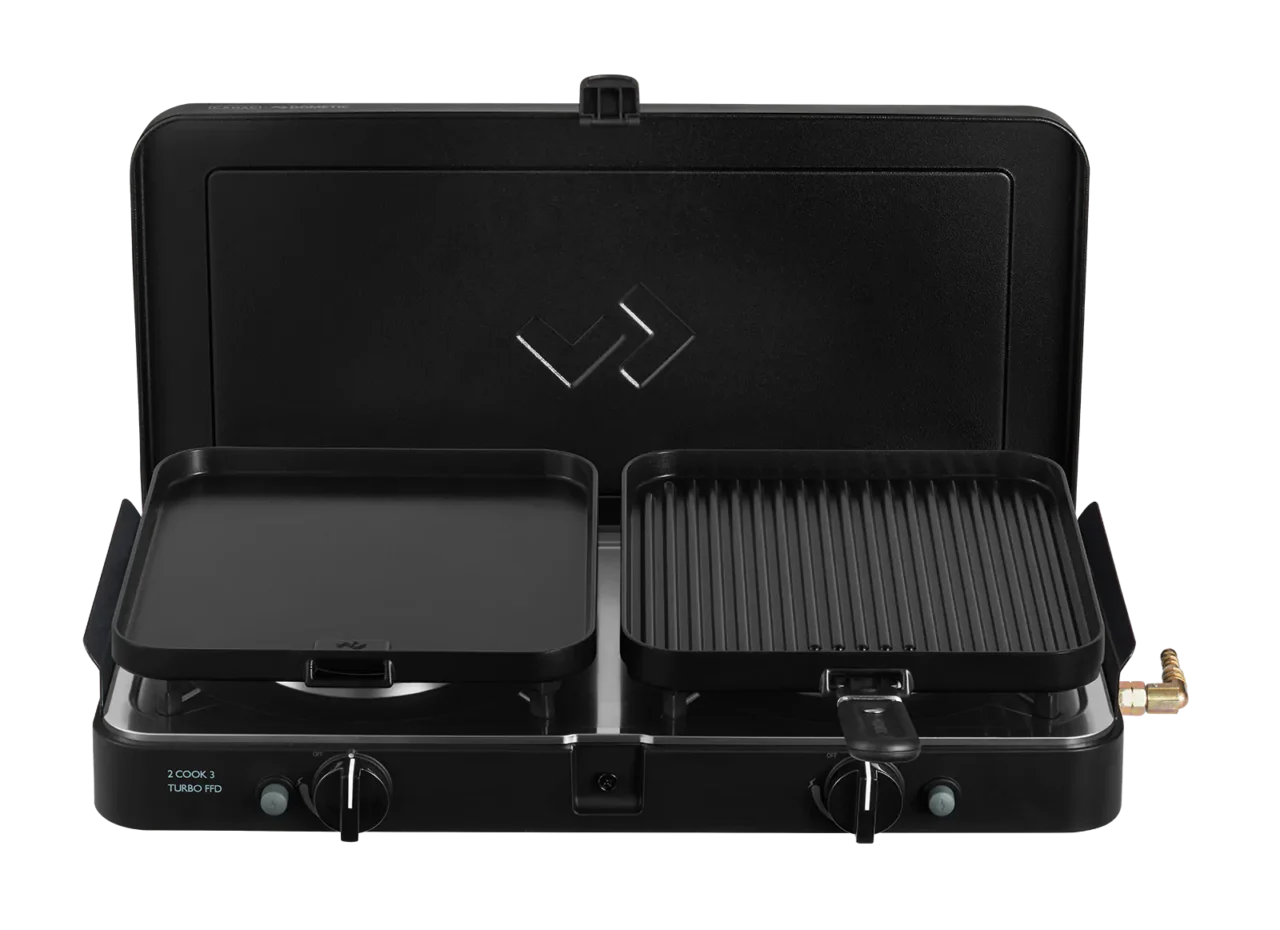 S modelom 2 Cook Turbo FFD to postaje stvar prošlosti. Ovaj svestrani plinski štednjak opremljen je sigurnosnim uređajem za prekid dovoda plina (FFD), koji automatski isključuje dovod plina ako se plamen slučajno ugasi. Time se omogućuje sigurnije kuhanje u zatvorenom i na otvorenom, što je posebno korisno kada se vrijeme pogorša pa trebate kuhati u šatoru, kamperu ili motorhome vozilu.