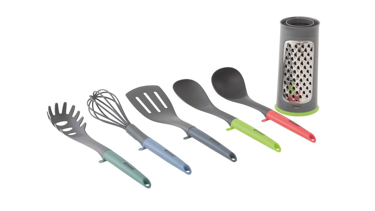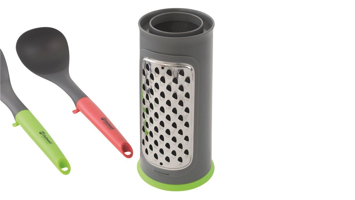 Adana je set posuđa s ručkama svijetlih boja koje se lako drže i pet alata za kuhanje koji se kače na stabilan stalak koji se može koristiti kao ribež.