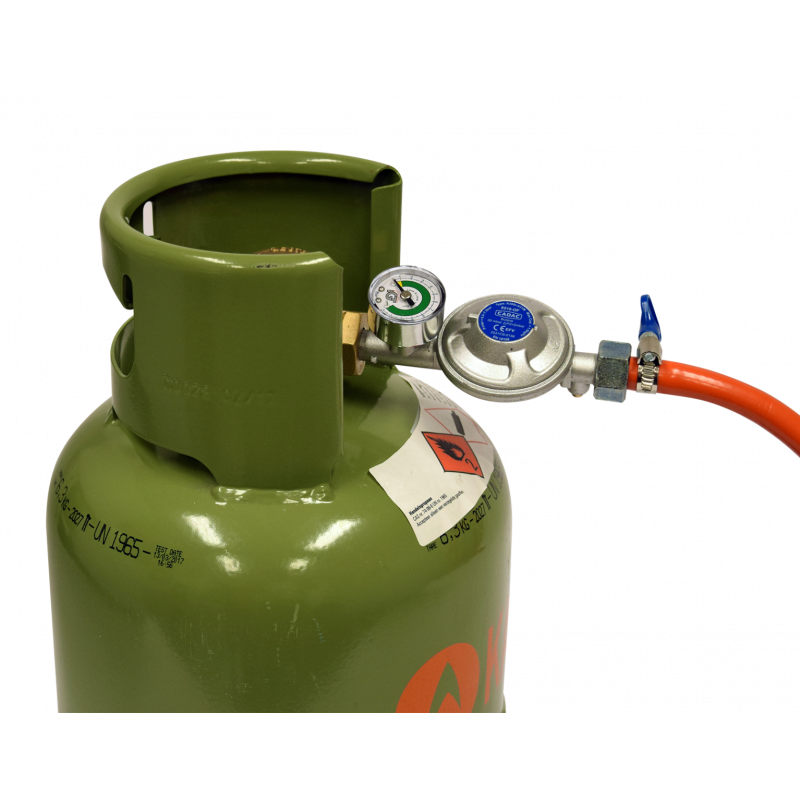 Set se sastoji od regulatora tlaka plina s univerzalnim priključkom (ulaz: ½” lijevi unutarnji navoj, izlaz: ¼” lijevi vanjski navoj), cilindrični manometar, crijevo za plin od 85 cm i 2 stezaljke za crijeva.