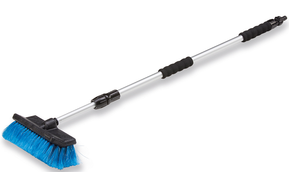 Praktična četka s teleskopskom anodiziranom aluminijskom drškom i drškom protiv klizanja. Opremljen priključkom za crijevo s brzim otpuštanjem na jednom kraju za upotrebu s tekućom vodom. Četkica s mekanim čekinjama pogodna za sve površine.