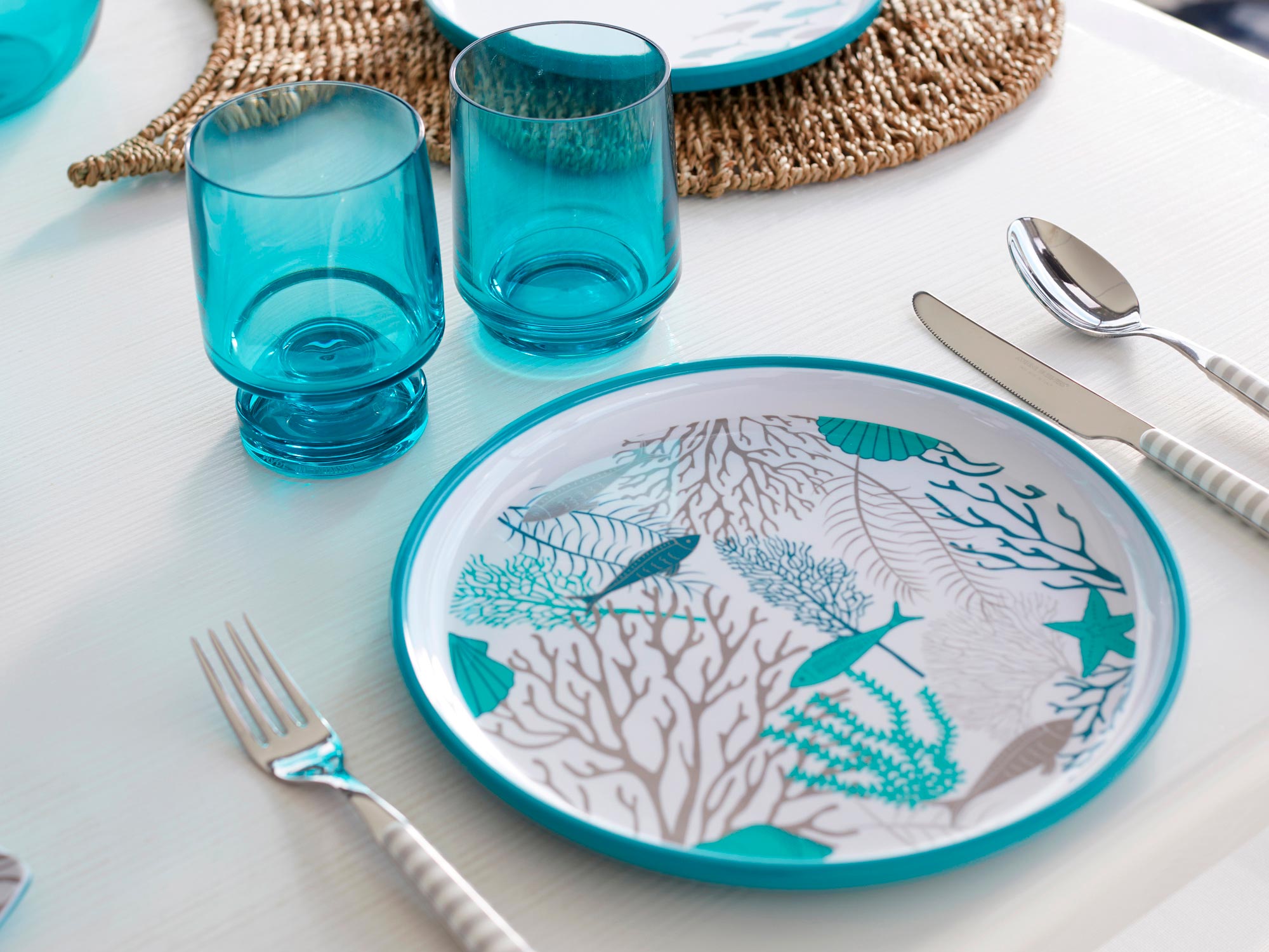Ravni tanjur od melamine COASTAL s protukliznom gumom na dnu, savršen za plovidbu.