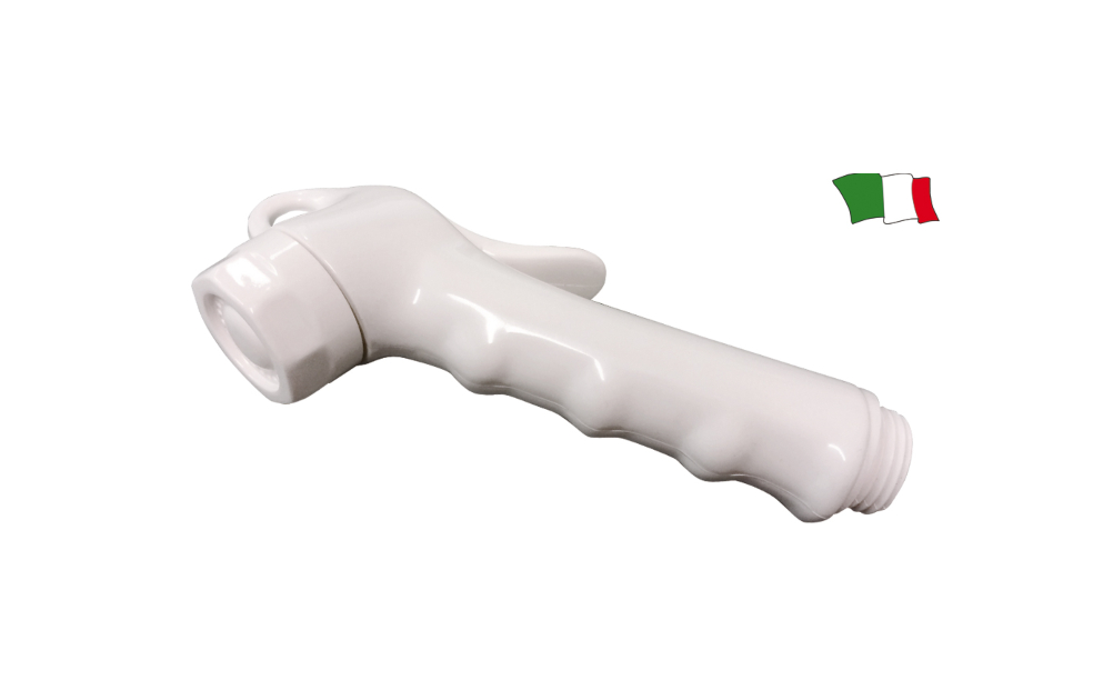 Kompaktni tuš bijele boje s gumbom i ergonomskim rukohvatom.