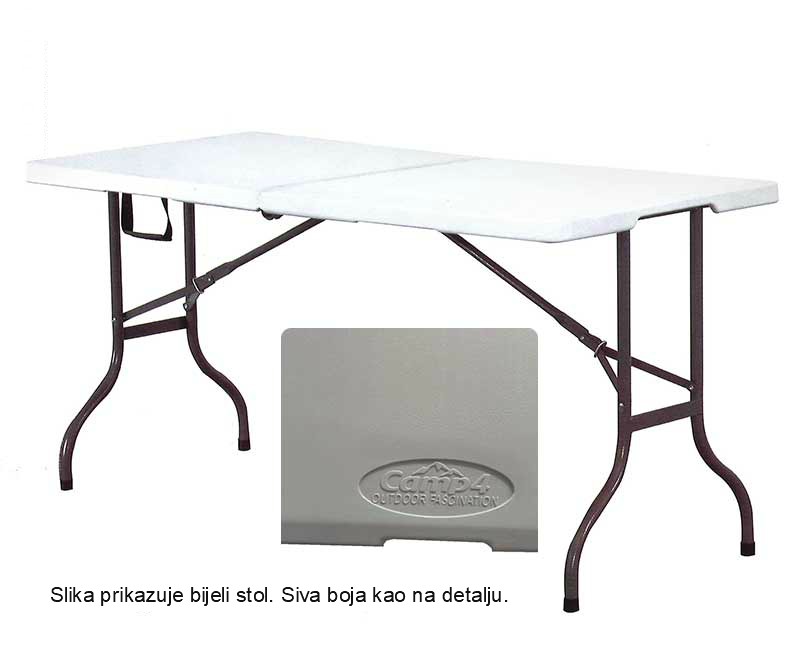 Sklopivi stol, u sivoj boji. Lako se postavlja i lako se čisti. Za 6 osoba. Višenamjenska upotreba, npr. za kampiranje, ugostiteljstvo, konferencije, tržnice i događanja.