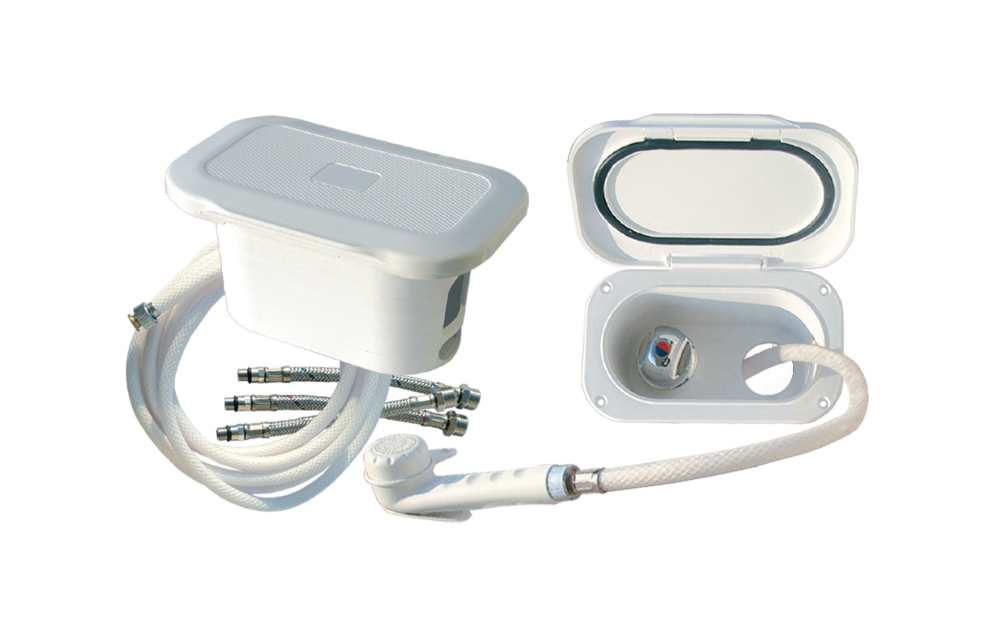 Komplet za tuširanje bijele boje u kompletu s slavinom za miješanje i crijevom od 5 m.