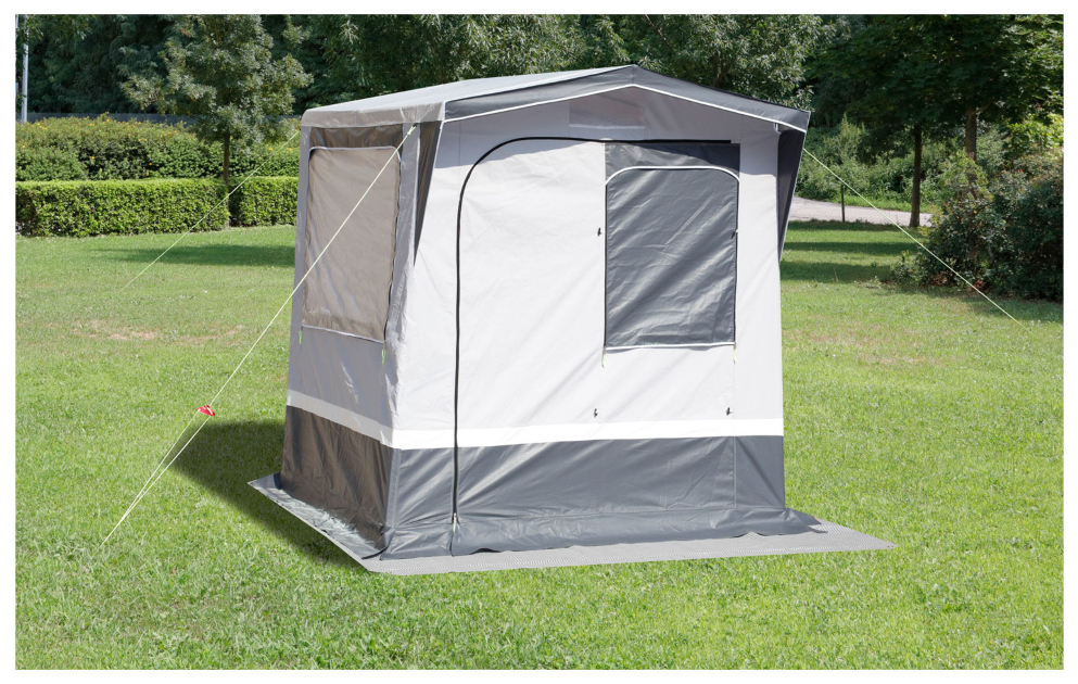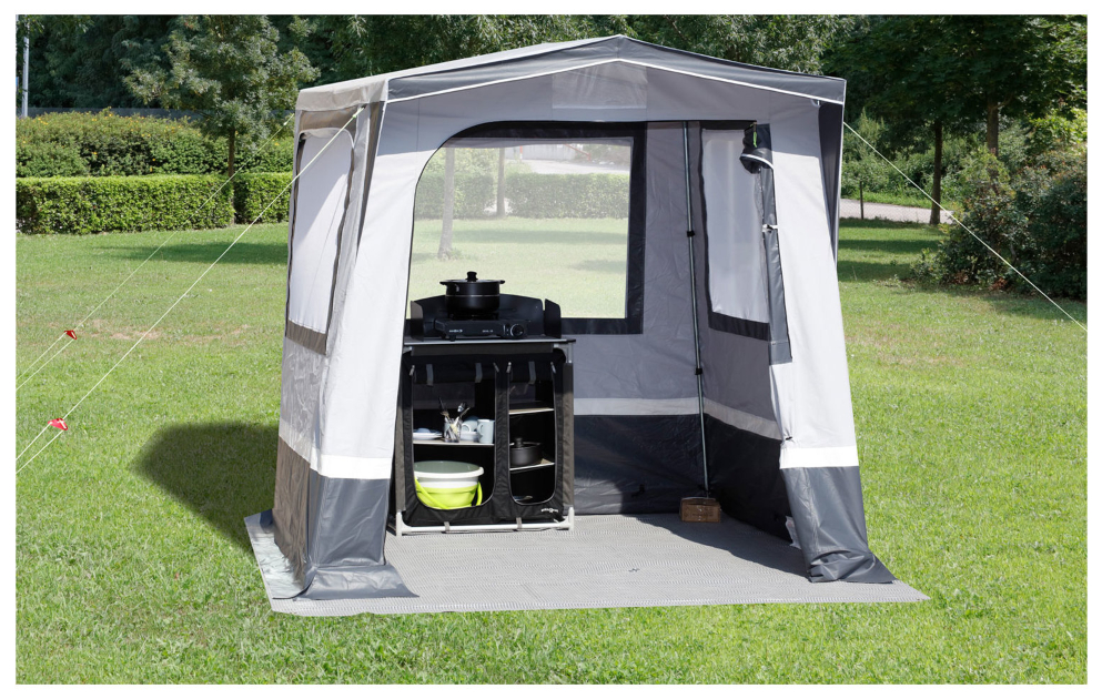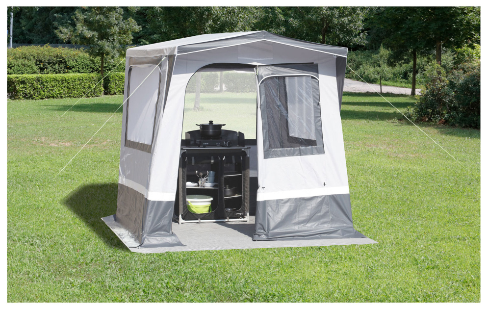 Moderan višenamjenski šator. Savršeno služi kao šator za kuhinju i opremu za zaštitu svih predmeta koji se ne mogu ostaviti vani. Cijeli sloj šatora izrađen je od poliklorida, a podupire ga čvrsti čelični okvir promjera 22 mm. Tri velika prozora s komarcima i učinkovitom visokom ventilacijom osiguravaju optimalnu trajnu ventilaciju.