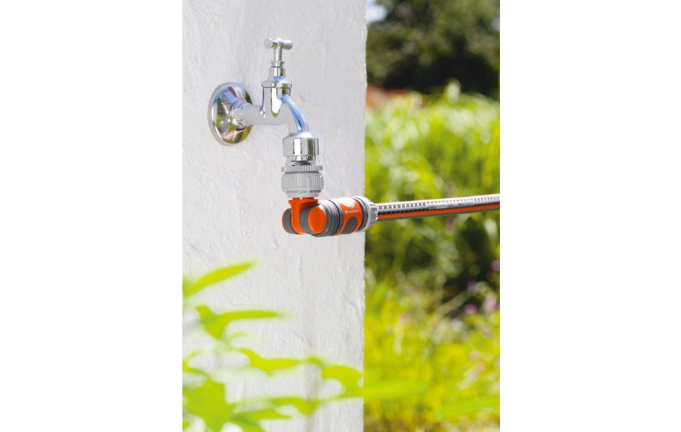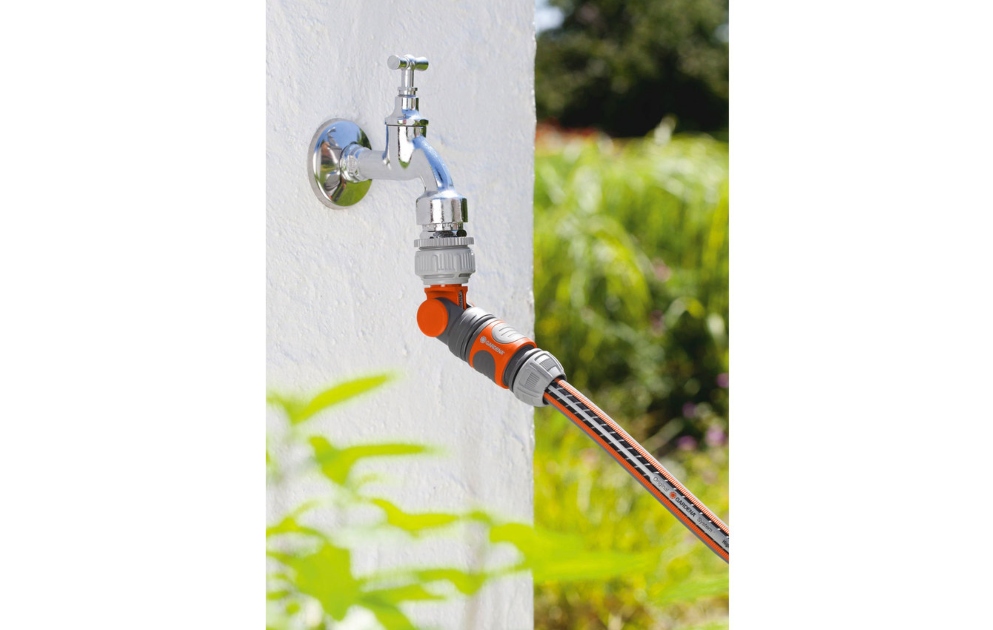 Okretni i priključni dio za slavinu s navojem od 33,3 mm (G 1 “) i 26,5 mm (G 3/4”). Komad slavine pod kutom Gardena omogućuje sistemsko spajanje crijeva na slavinu. Tako voda uvijek može nesmetano teći i crijevo nije oštećeno.