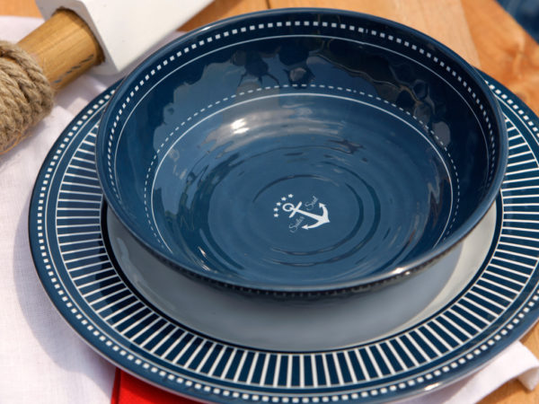 Činija od melamina SAILOR SOUL korisna je za juhe, tjestenine ili žitarice i dio je seta neuništive melaminske posude Sailor Soul, koji uključuje plitke tanjure, duboke tanjure i tanjure za desert, dekorirane u pomorskom stilu s motivima sidra i pruga.