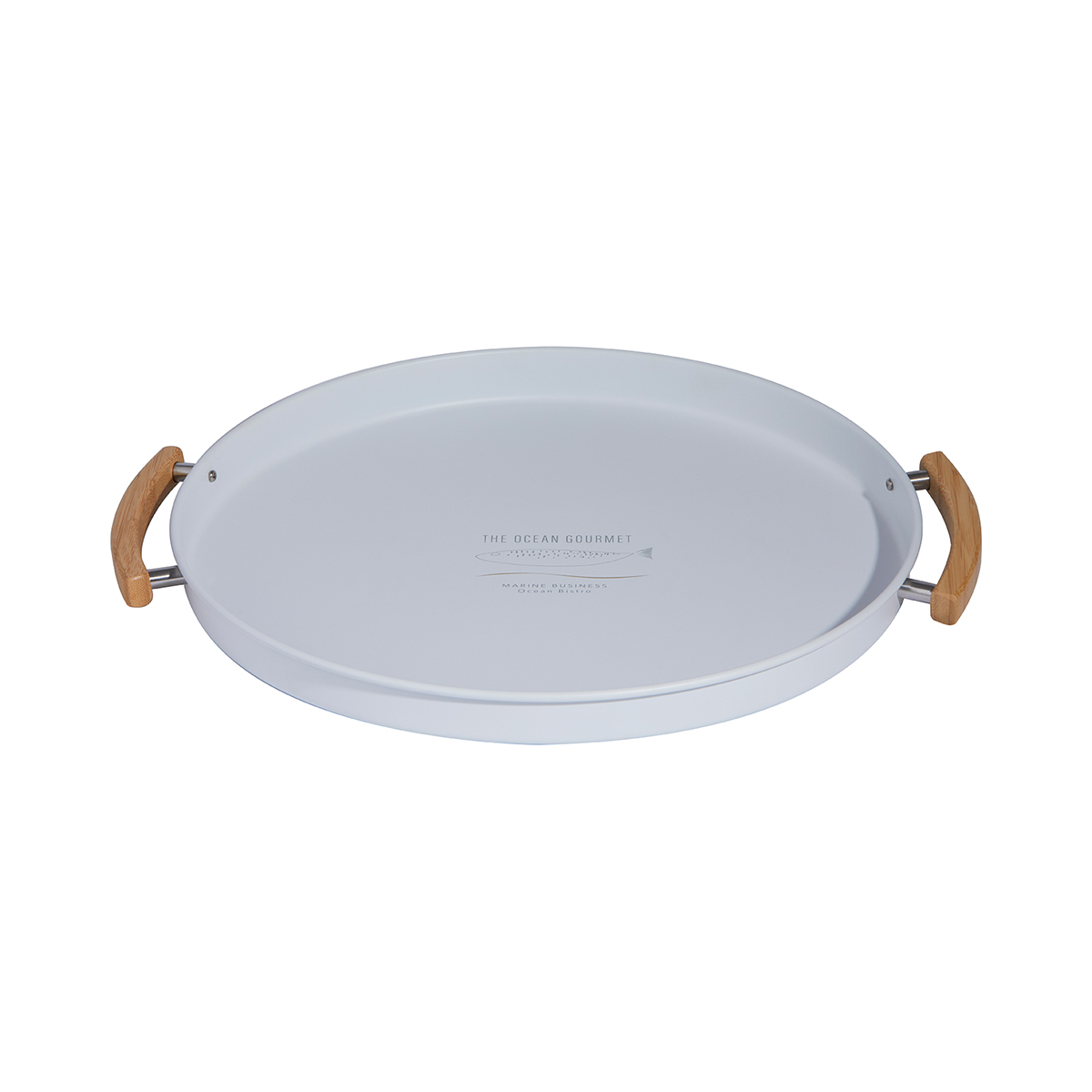 Prekrasan bijeli pladanj s drvenim ručkama i lijepim središnjim dizajnom s dodirom zlatne boje.