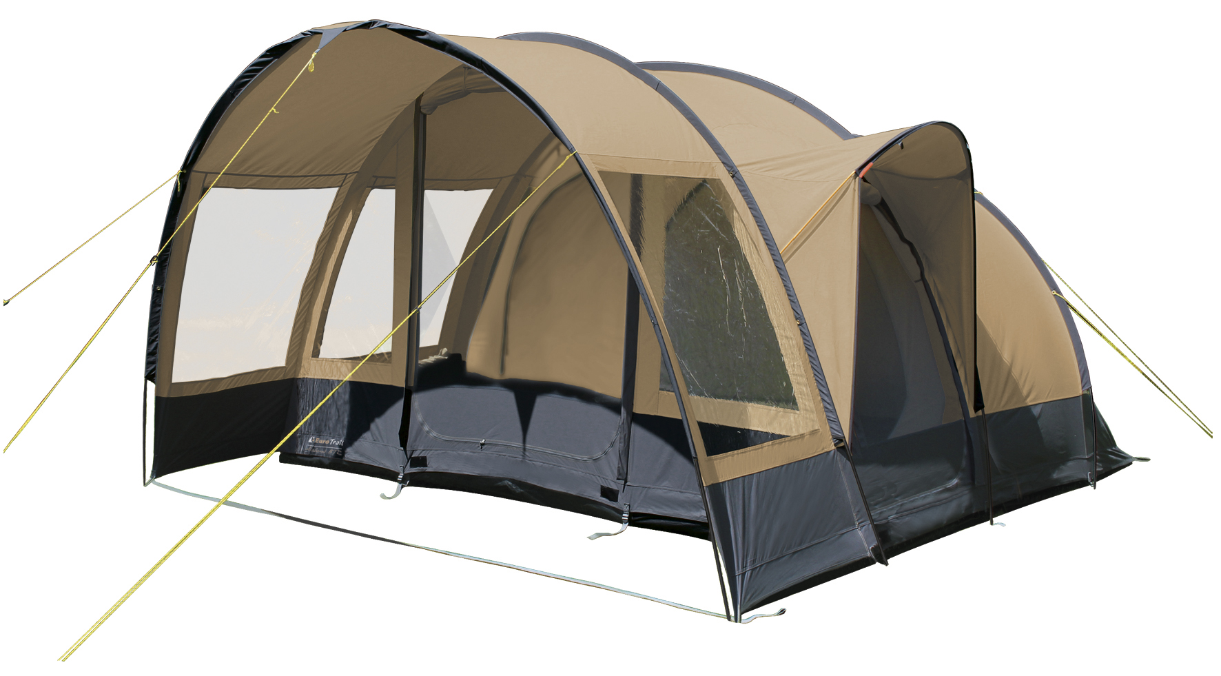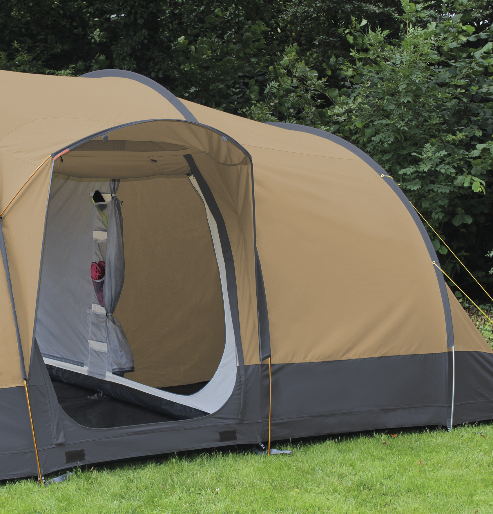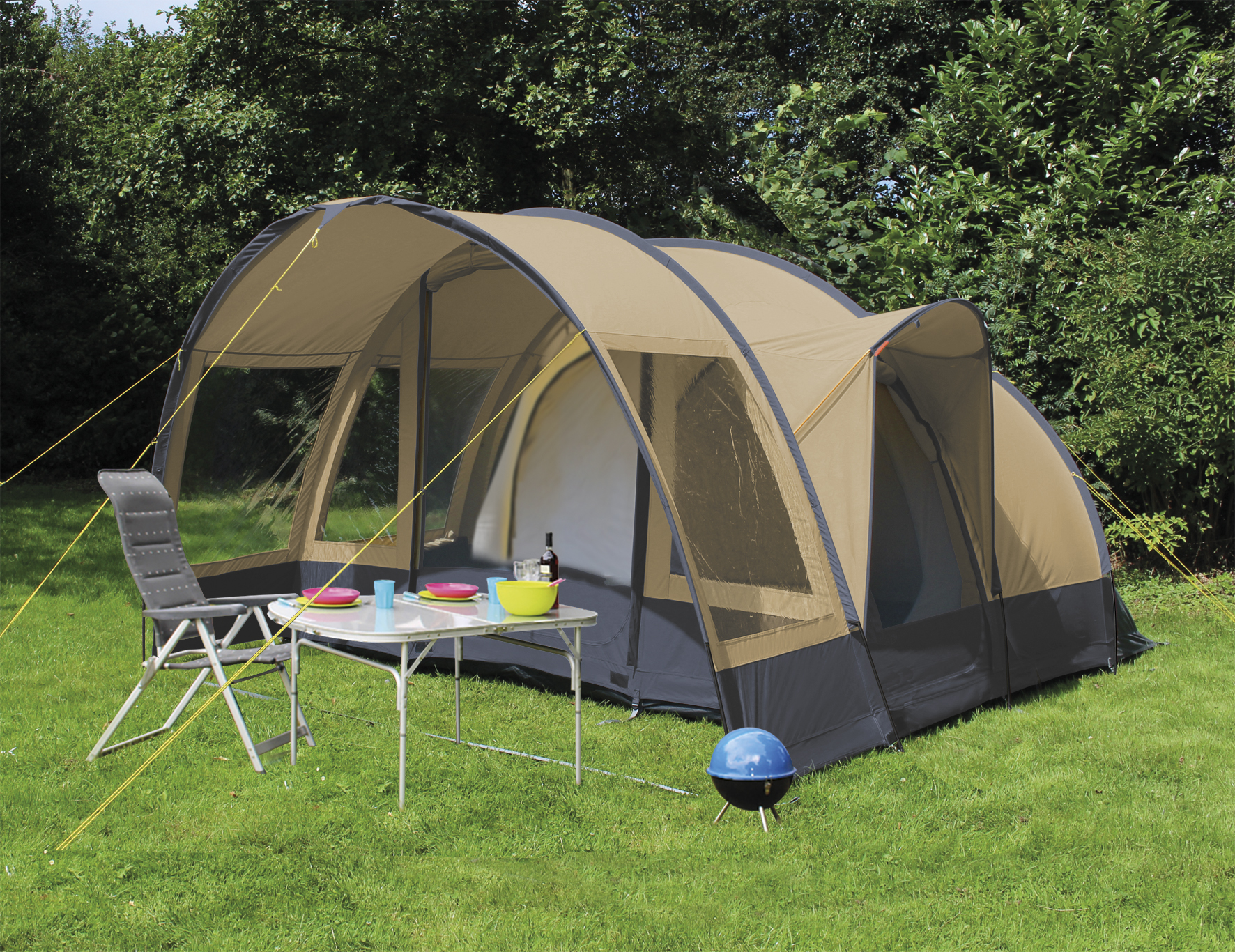 “Obiteljski šator izrađen od prozračnog poliestera/pamuka, pogodan za 4 do 5 osoba. Veliki dnevni prostor s velikim prozirnim prozorima naokolo za savršen panoramski pogled. Zaštitna nadstrešnica. Bočna i prednja vrata s dodatnim mrežastim vratima. Fiksna prednja nadstrešnica štiti vas od lošeg vremena, ali nudi vam i savršeno mjesto u sjeni za sjedenje i opuštanje. Potpuno ušivena podna plahta, unutarnji šator može se podijeliti u 2 prostrane sobe, organizator u prednjem zidu kao i džepovi za privatnost unutar unutarnjeg šatora. Dodatno dostupan tepih za šator.Jaki aluminijski stupovi.