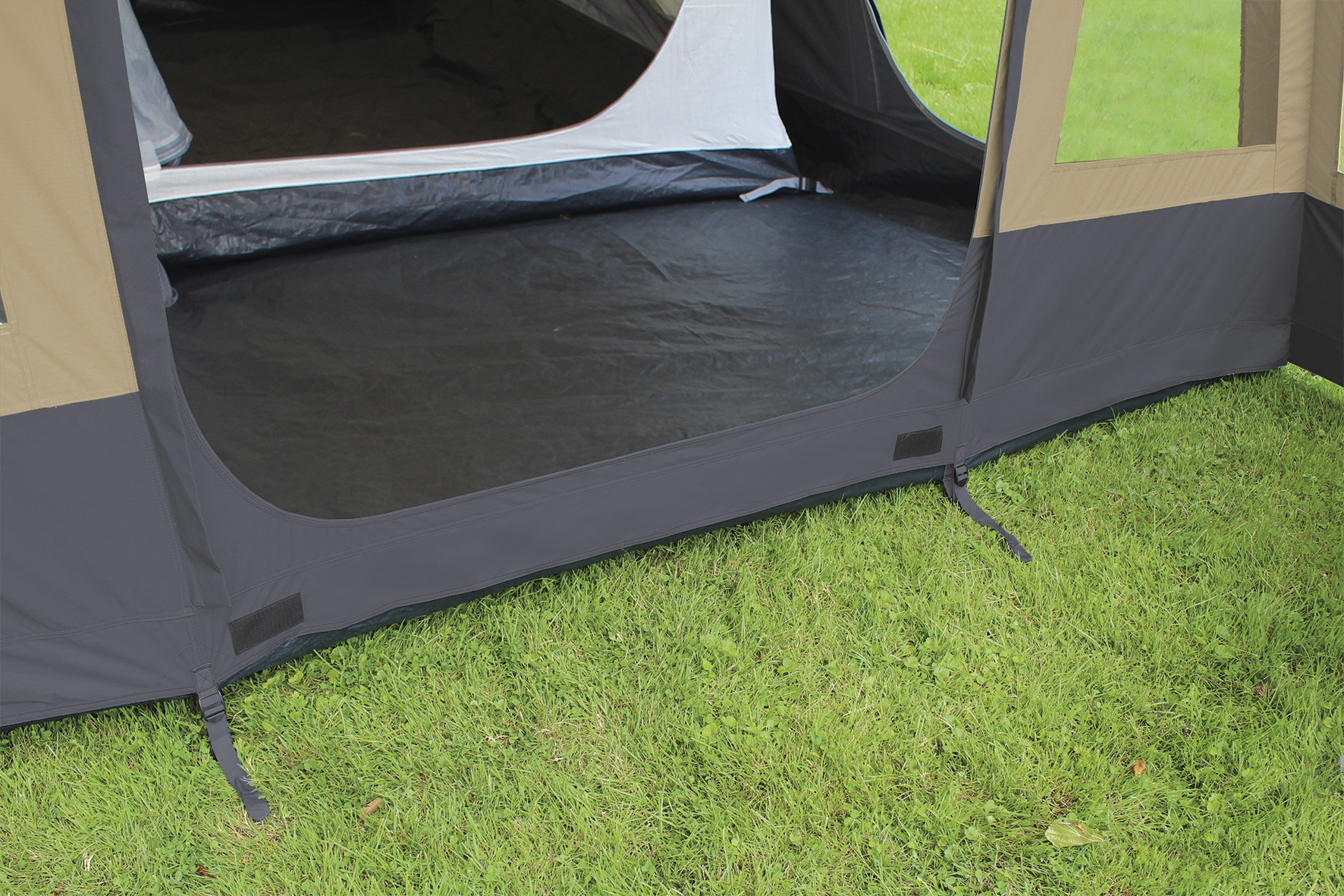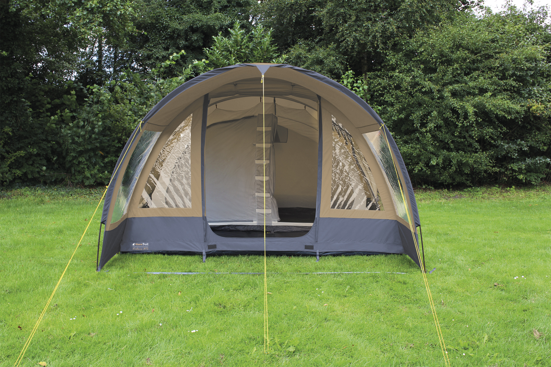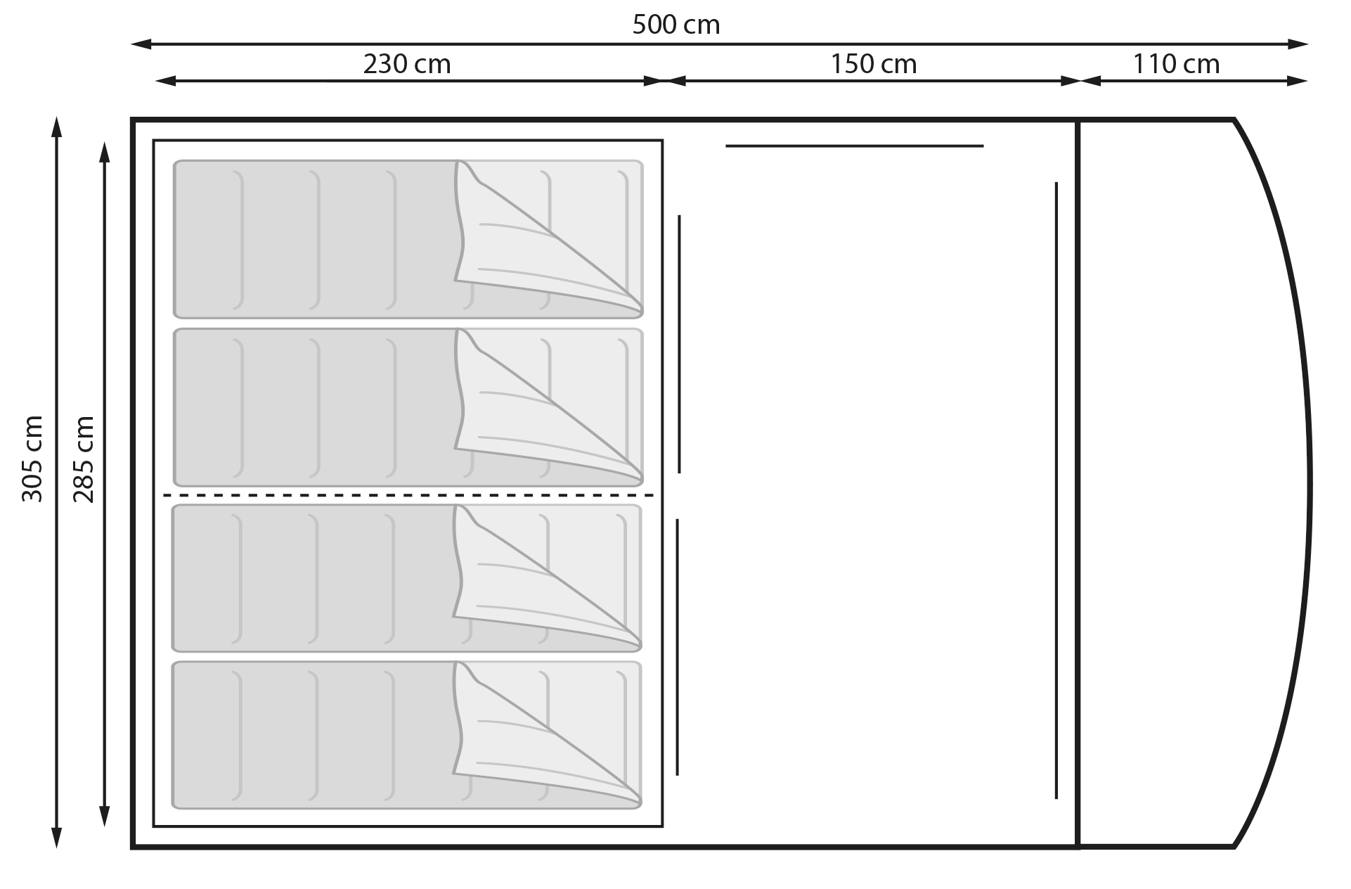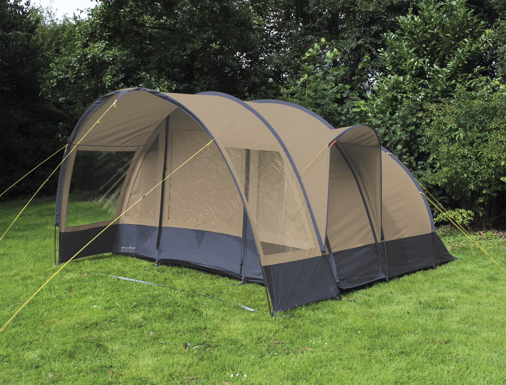 “Obiteljski šator izrađen od prozračnog poliestera/pamuka, pogodan za 4 do 5 osoba. Veliki dnevni prostor s velikim prozirnim prozorima naokolo za savršen panoramski pogled. Zaštitna nadstrešnica. Bočna i prednja vrata s dodatnim mrežastim vratima. Fiksna prednja nadstrešnica štiti vas od lošeg vremena, ali nudi vam i savršeno mjesto u sjeni za sjedenje i opuštanje. Potpuno ušivena podna plahta, unutarnji šator može se podijeliti u 2 prostrane sobe, organizator u prednjem zidu kao i džepovi za privatnost unutar unutarnjeg šatora. Dodatno dostupan tepih za šator.Jaki aluminijski stupovi.
