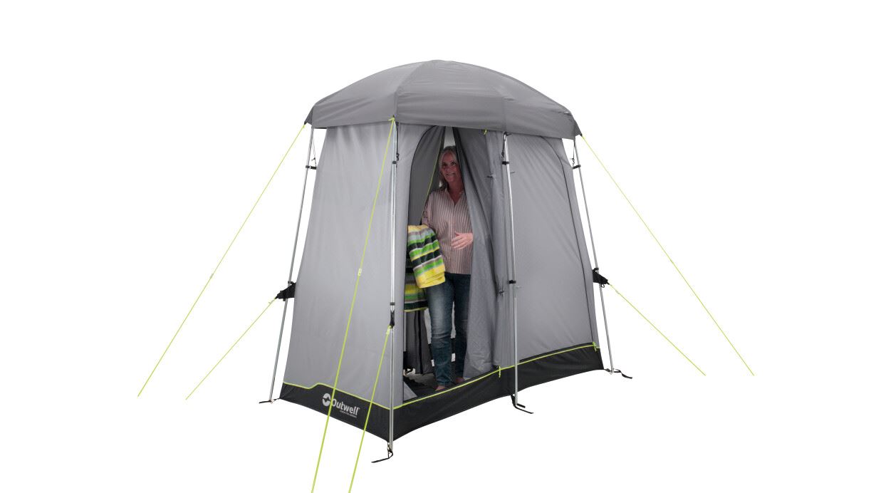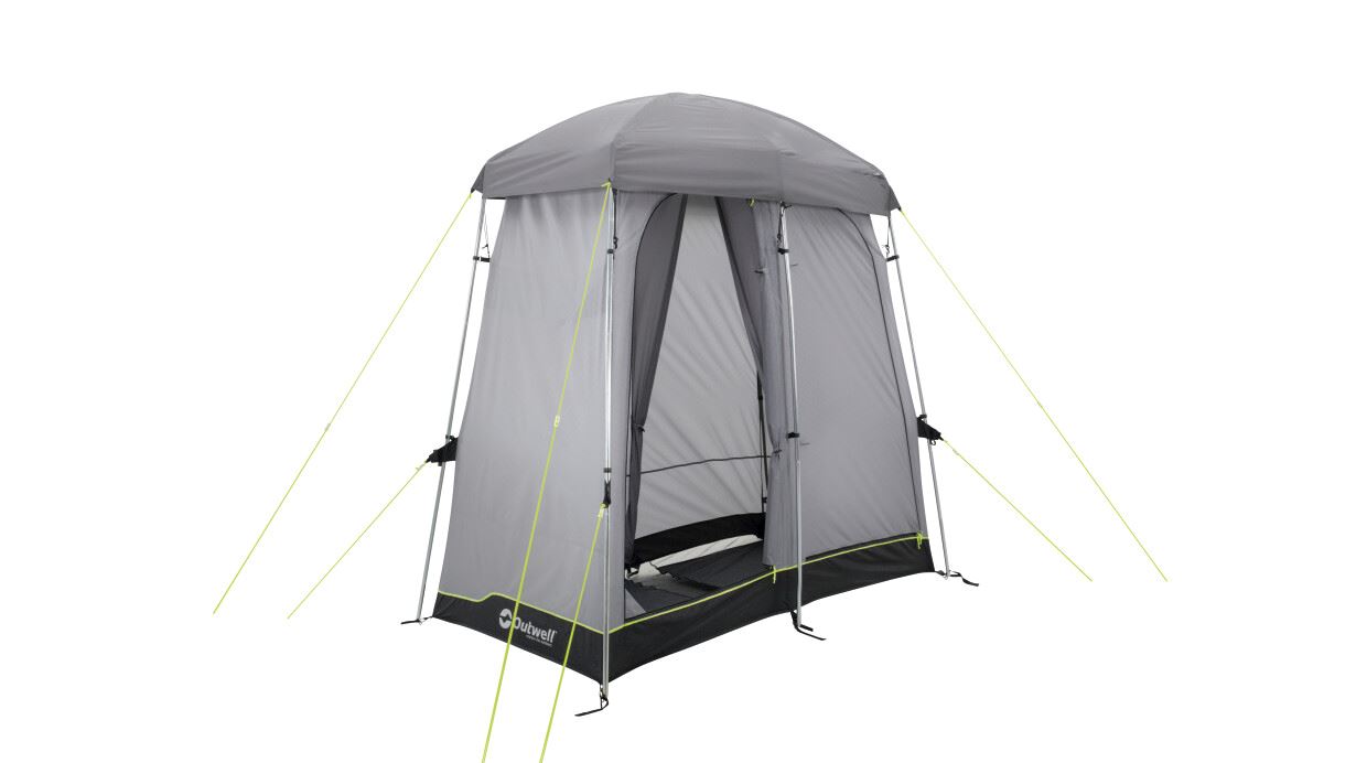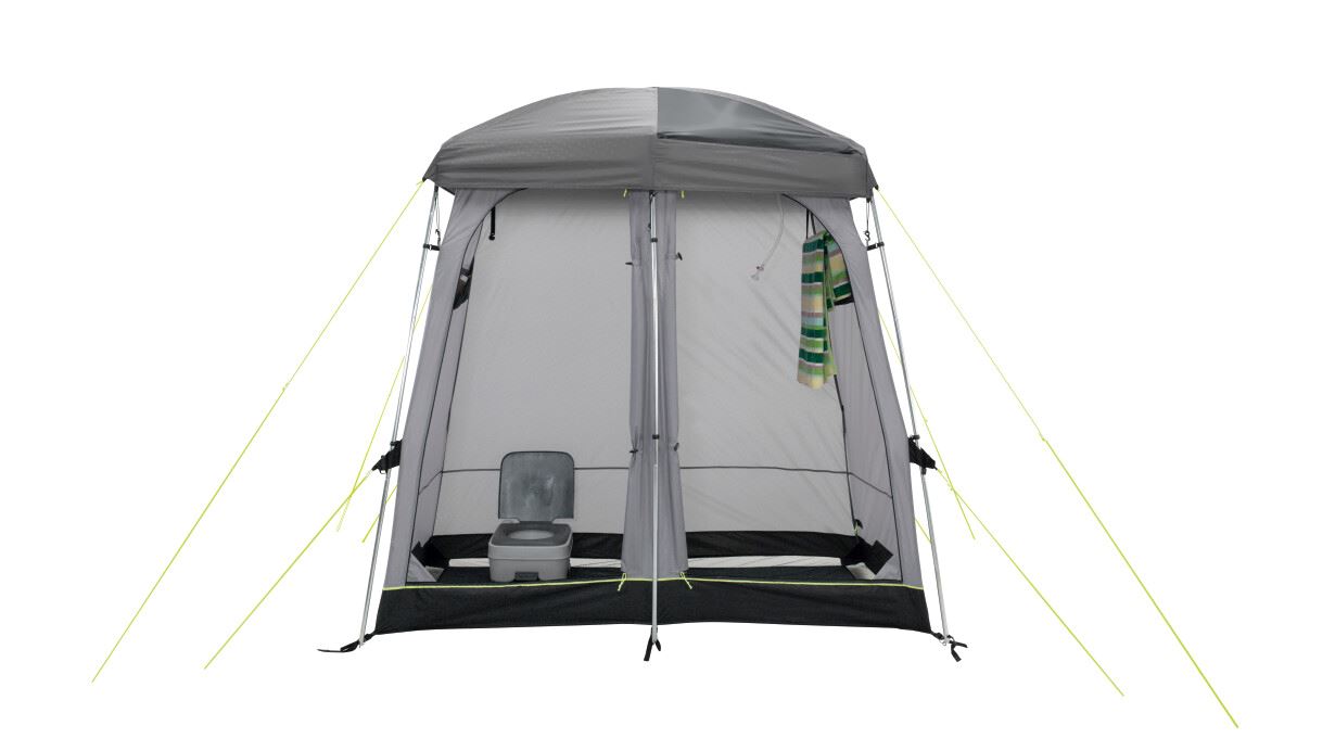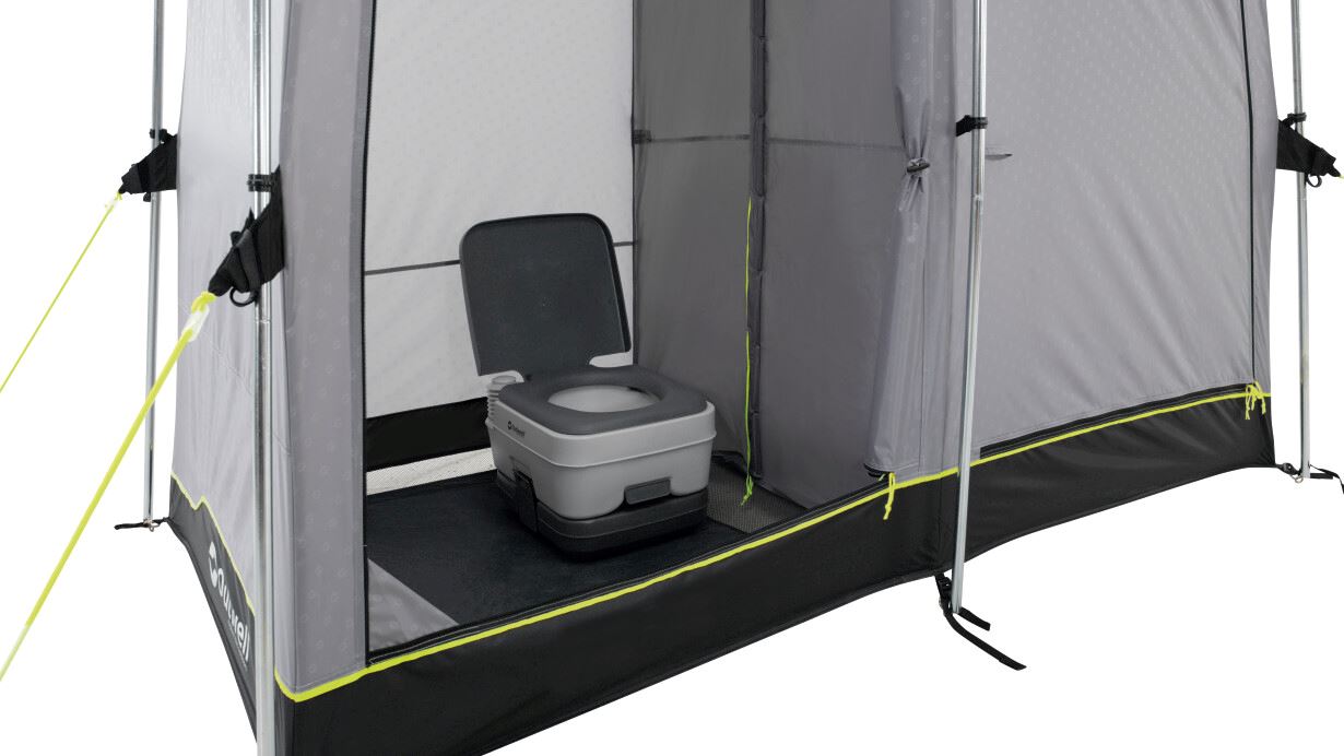 Dovodeći praktičnost na mjesto postavljanja. Ovaj dvostruki toaletni šator nudi mogućnost diskretnog smještaja kemijskog WC-a ili za presvlačenje nakon što napustite odvojenu prostoriju za tuširanje. Ova prostorija ima ociju za Outwell vreću za tuširanje, koja se nalazi ispod vinilnog krovnog prozora kako bi sunčevi zraci zagrijali vodu. Ostale značajke uključuju brza i tiha povezujuća vrata, zaštićene ventilacijske panele, ručnik držač, džepove i pod s mrežicom za odvodnju.