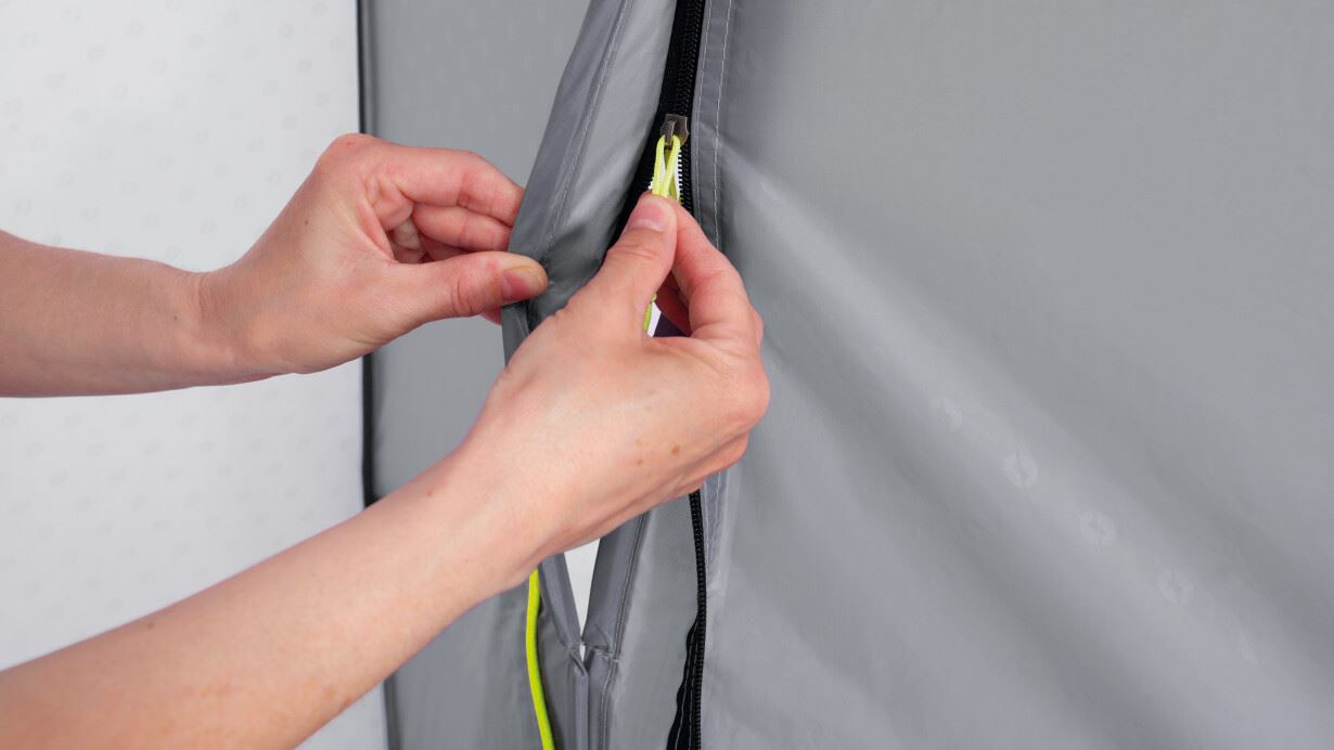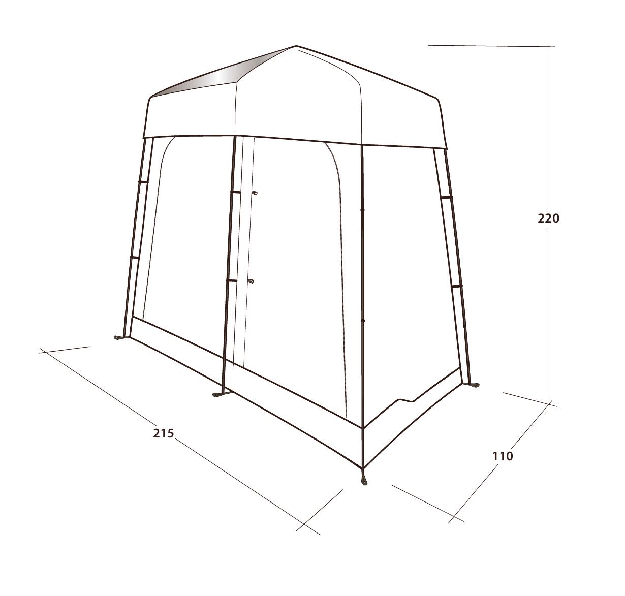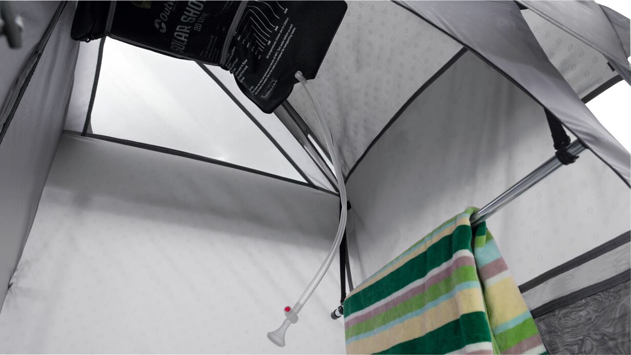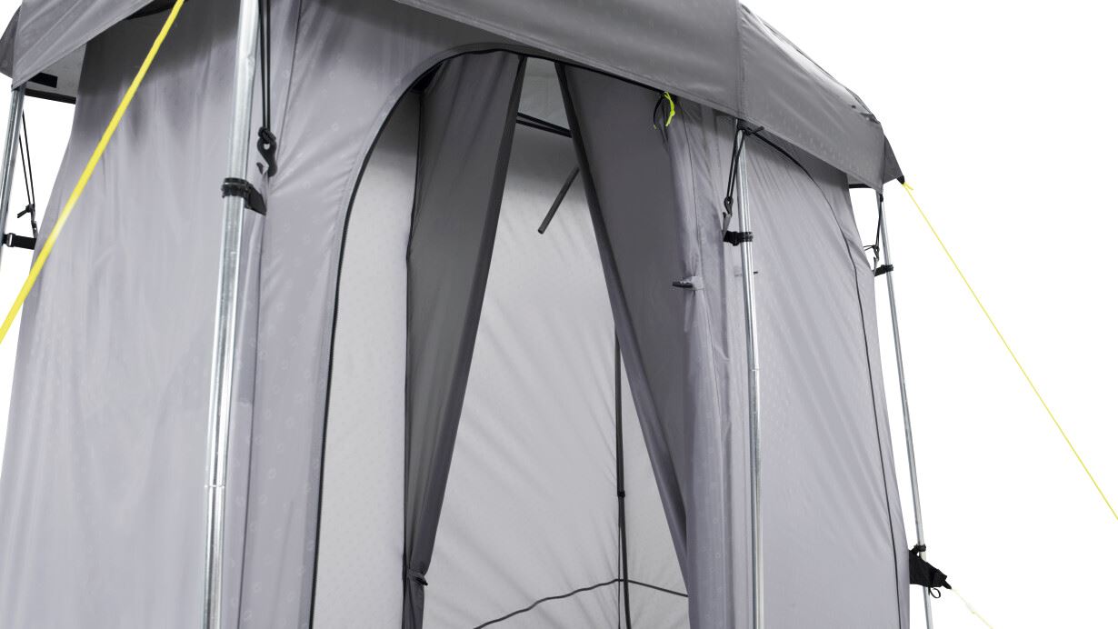 Dovodeći praktičnost na mjesto postavljanja. Ovaj dvostruki toaletni šator nudi mogućnost diskretnog smještaja kemijskog WC-a ili za presvlačenje nakon što napustite odvojenu prostoriju za tuširanje. Ova prostorija ima ociju za Outwell vreću za tuširanje, koja se nalazi ispod vinilnog krovnog prozora kako bi sunčevi zraci zagrijali vodu. Ostale značajke uključuju brza i tiha povezujuća vrata, zaštićene ventilacijske panele, ručnik držač, džepove i pod s mrežicom za odvodnju.