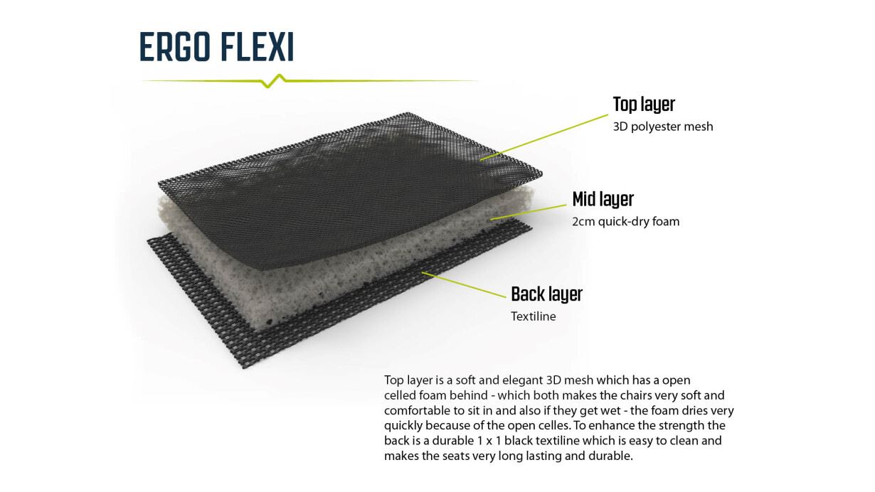 Galana kombinira brzosušeću podstavu s tkaninom od tekstilina u elegantnoj crnoj boji. Stolica ima podesiv, odvojivi naslon za glavu i ima vodootporan materijal ispod tkanine kako bi se spriječilo upijanje vode od strane pjenaste podstave ako ostane izložena kiši.