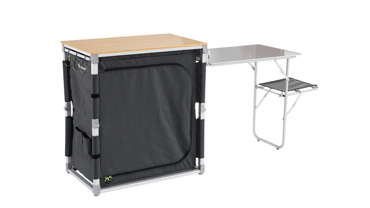 Najbolja mobilna kuhinja! Pripremite hranu, kuhajte, perite i pospremite s lakoćom, bilo gdje, uz Padres kuhinjski stol i bočnu jedinicu. Otvara se za nekoliko sekundi i pruža veliku radnu površinu od bambusa, bočni stol, izvlačivi držač za posudu za pranje posuđa i kantu za smeće s poklopcem. Praktični bočni džepovi idealni su za pribor i začine. Kad se ne koristi, jednostavno se sklopi i spakira u torbu za nošenje.