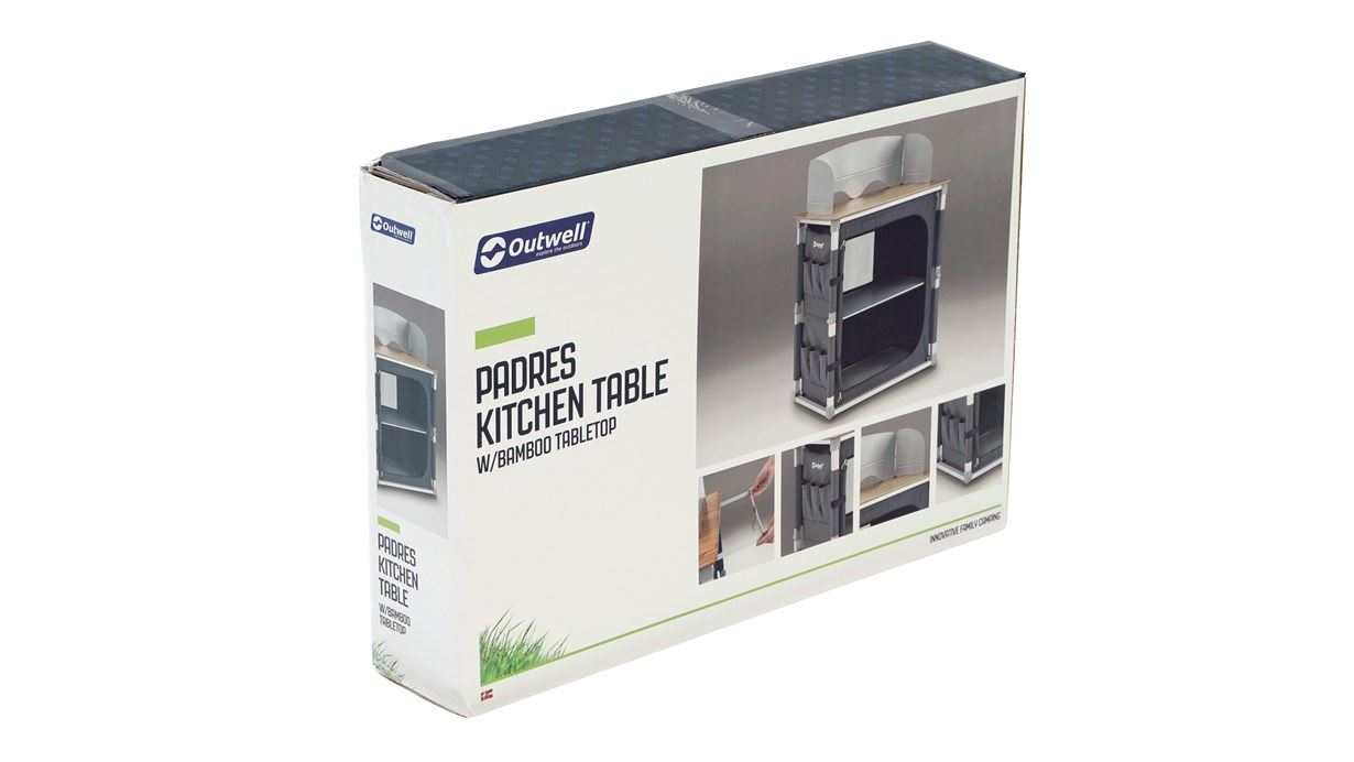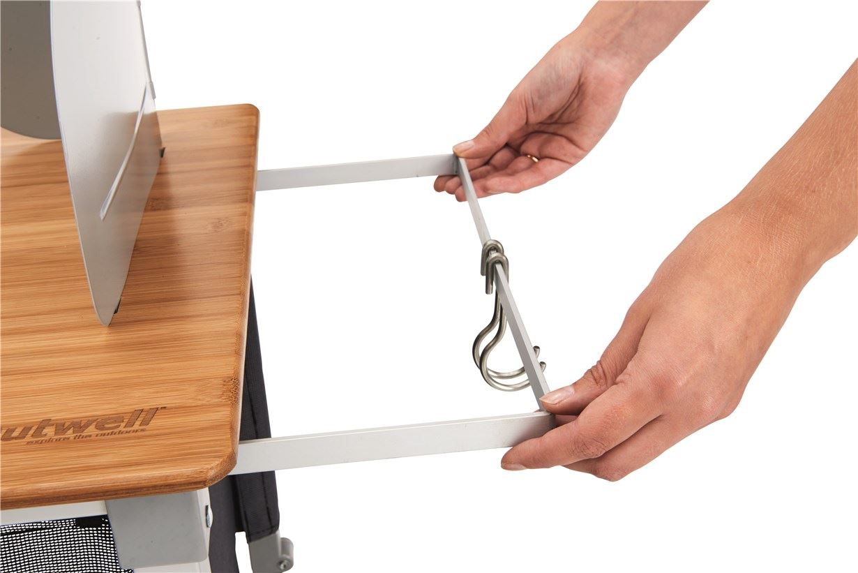Od elegantne crno/sive tkanine s pločom stola od čvrstog bambusa, s tri praktične kuke s jedne strane i džepom za pohranu s druge strane. Kuhinjski stol uključuje ‘izvlačni’ držač za posudu za pranje ili vreću za smeće i vjetrobran za zaštitu od plamena plamenika.