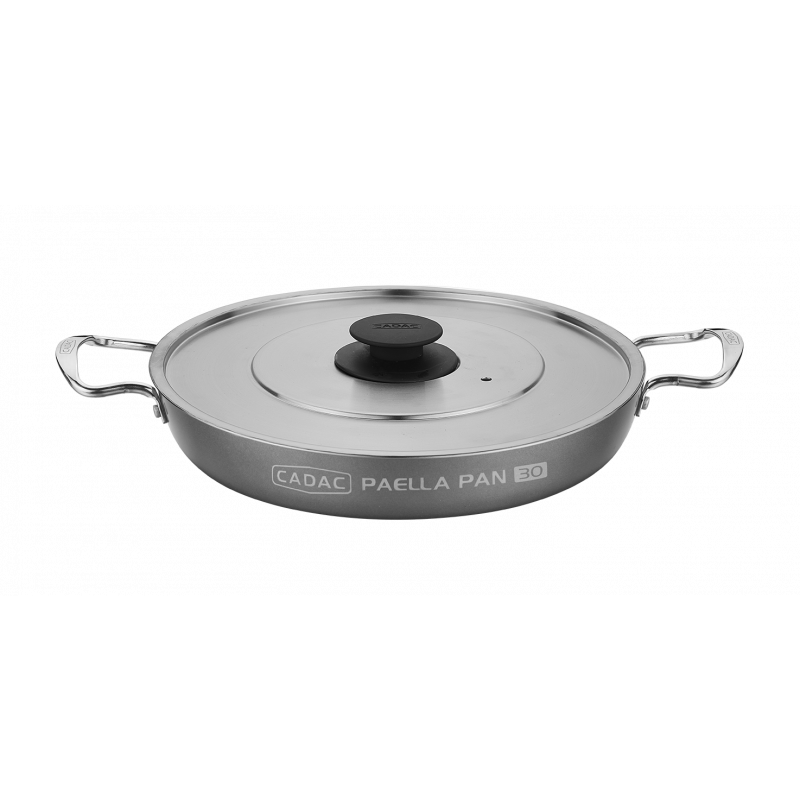 Lagana, ali debela aluminijska tava za paellu od 28 cm ima keramički premaz i jednostavna je za korištenje i čišćenje. Visokokvalitetne ručke od nehrđajućeg čelika omogućuju jednostavno rukovanje. Tava je idealna za pripremu rižota, paella, jela od tjestenine, doručaka i drugih obroka za veći broj ljudi. Za korištenje na asortimanu CADAC Safari Chef ili bilo kojoj drugoj plinskoj ili električnoj ploči za kuhanje. Donja strana tave je prozirna, strojno obrađena čelikom. Priložena je praktična torba za pohranjivanje. Postavite tavu za paellu na stalak za lonac vašeg roštilja. Napomena: Na tavu za paellu se ne može staviti poklopac zbog ručki.