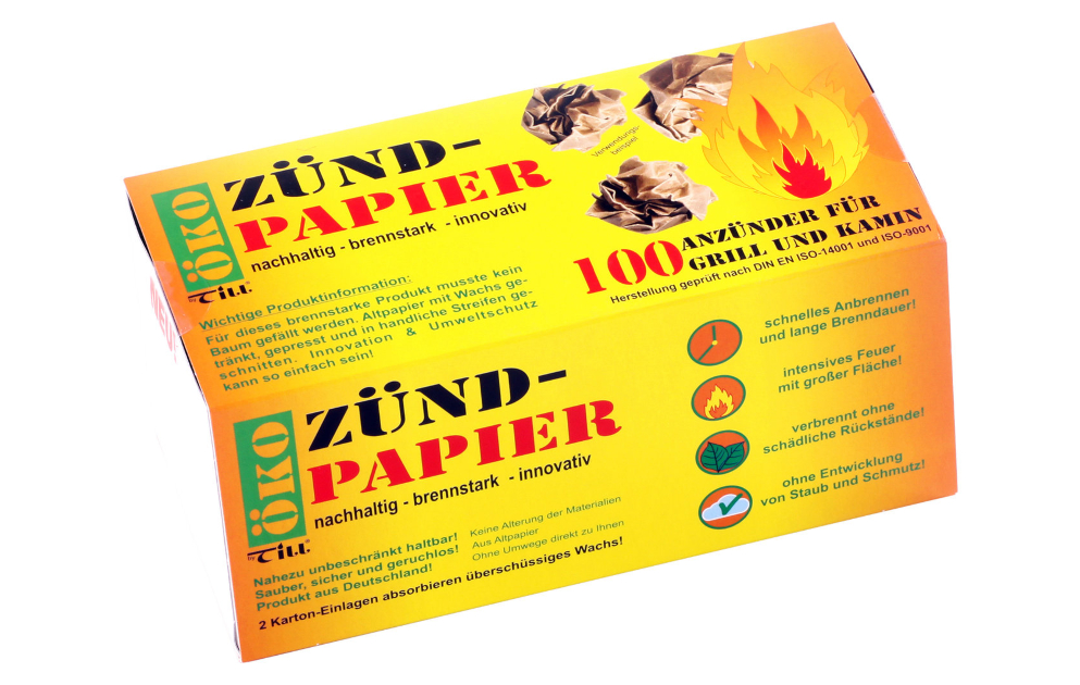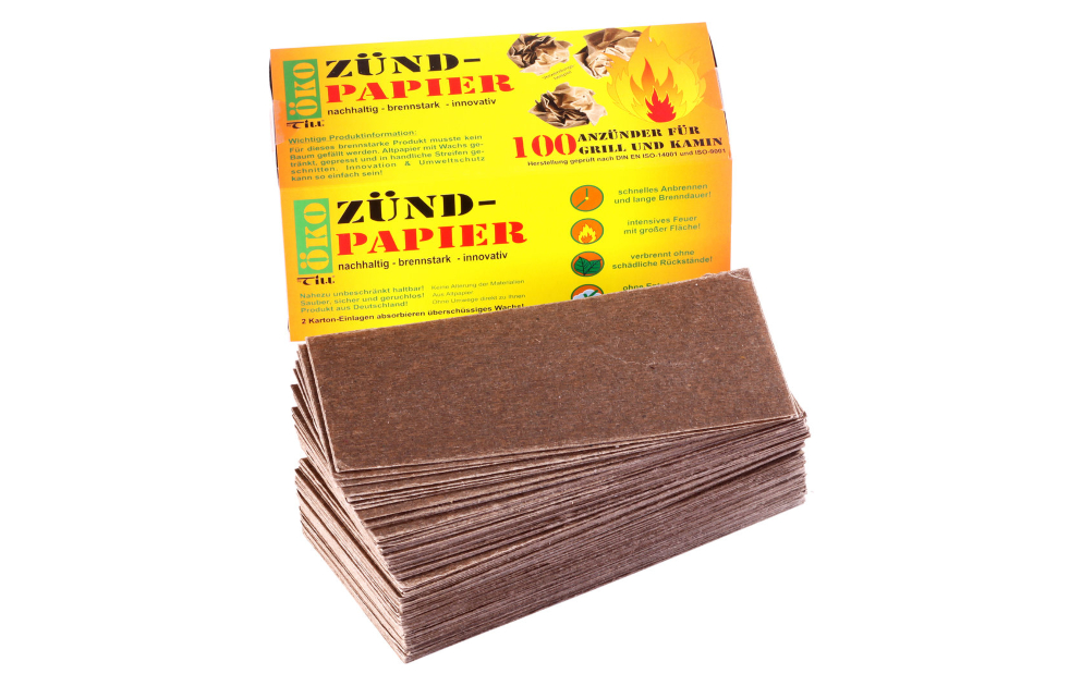 Papir za potpalu vatre. Nije bilo potrebno srušiti nijedno drvo zbog papira za paljenje. Izrađen je od otpadnog papira i natopljen voskom. Zatim se preša i izreže na zgodne trake kao granule.