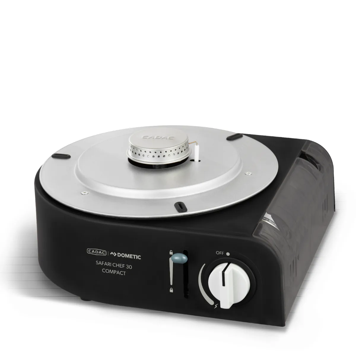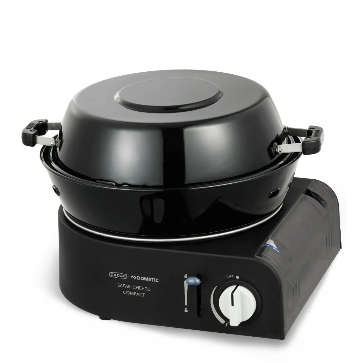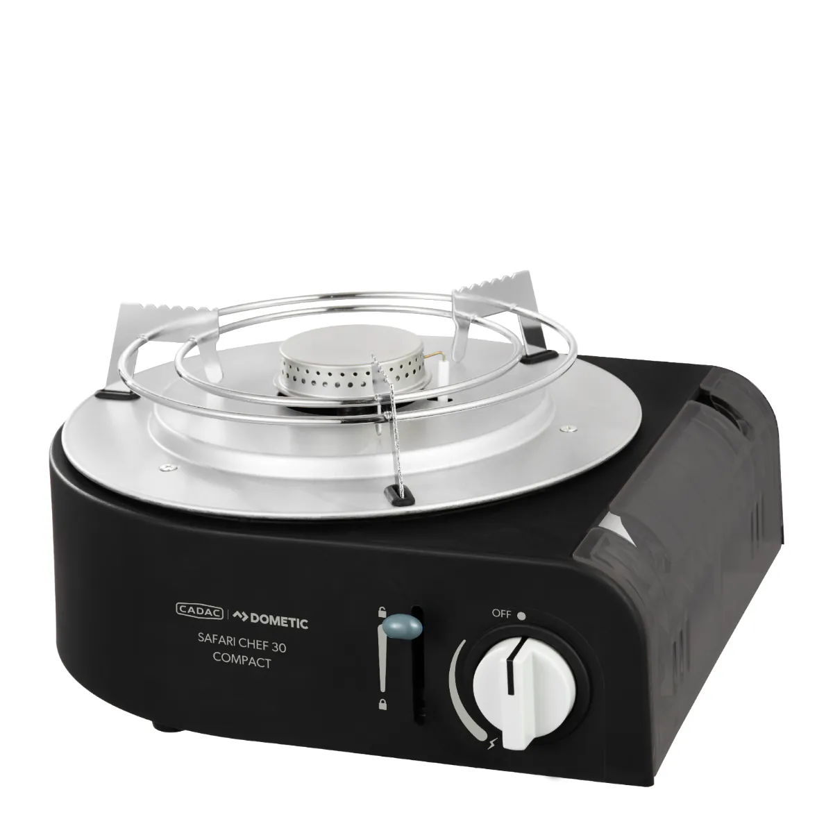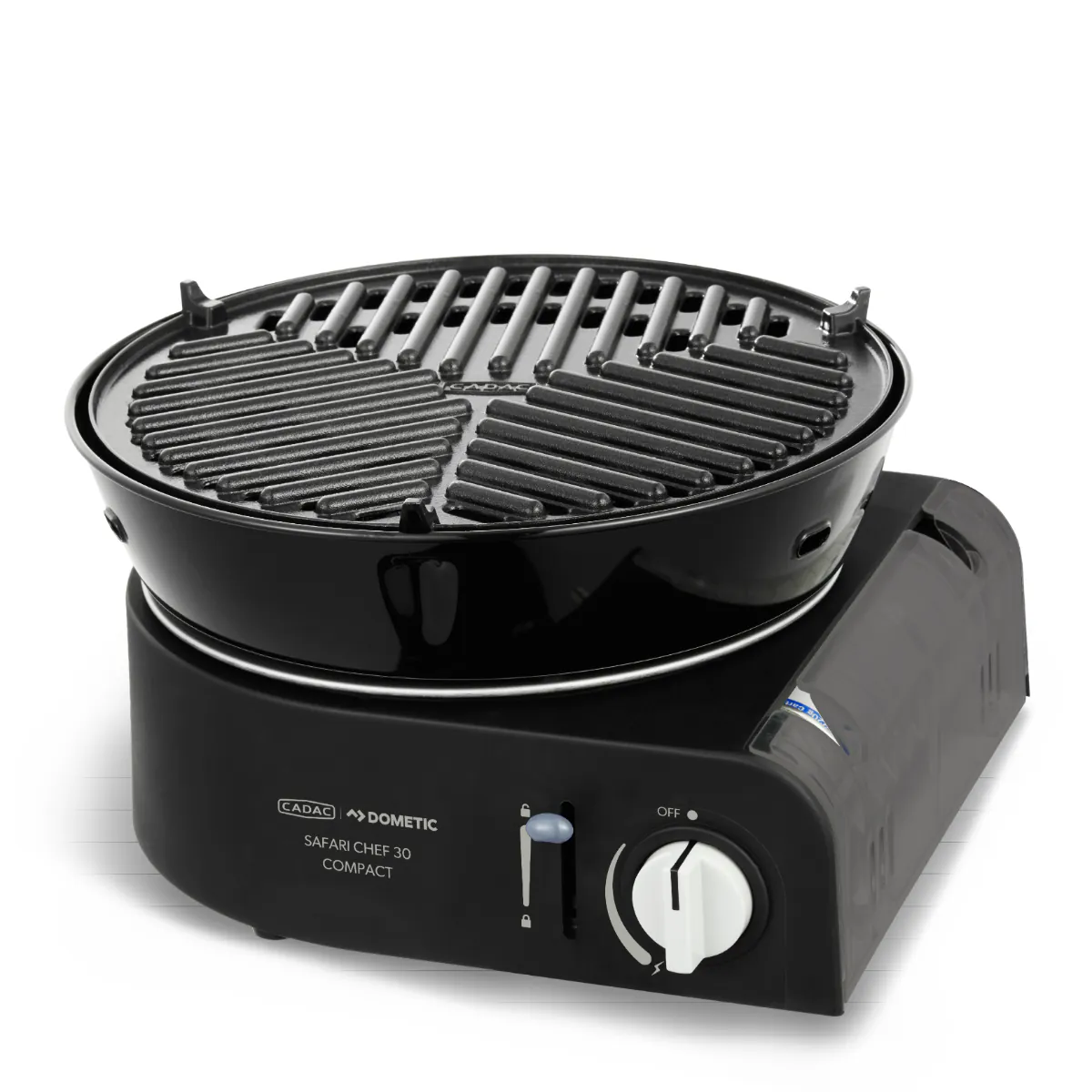 Safari Chef 30 Compact je ultrakompaktan i lagan plinski roštilj. Radi izravno na 227 g plinsku bocu, što ga čini idealnim za aktivnosti na otvorenom i kratka kampiranja. Jednostavno umetnite bocu u uređaj, zaključajte polugom i okrenite regulator za početak kuhanja ili pečenja.