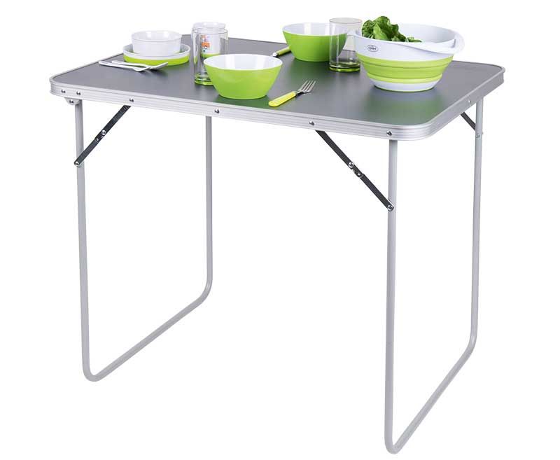 Sklopivi stol za kampiranje Twiggy III. Stol od MDF-a, u tamno sivoj boji, s cjevastim čeličnim okvirom i drškom.