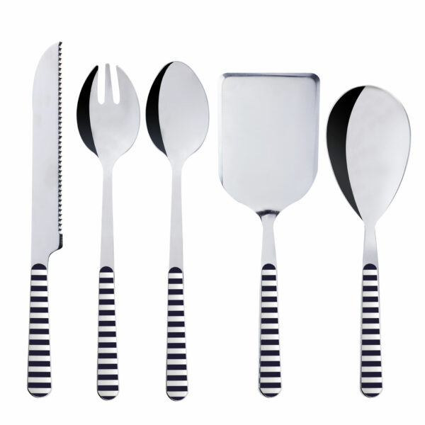 Dodajte eleganciju i funkcionalnost svojoj kuhinji ili nautičkom stolu s setom kuhinjskog pribora BLUE. Ovaj set od 5 komada izrađen je od visokokvalitetnog nehrđajućeg čelika s ergonomskim ABS plavim držalicama, savršenim za svakodnevnu upotrebu ili posluživanje na brodu.