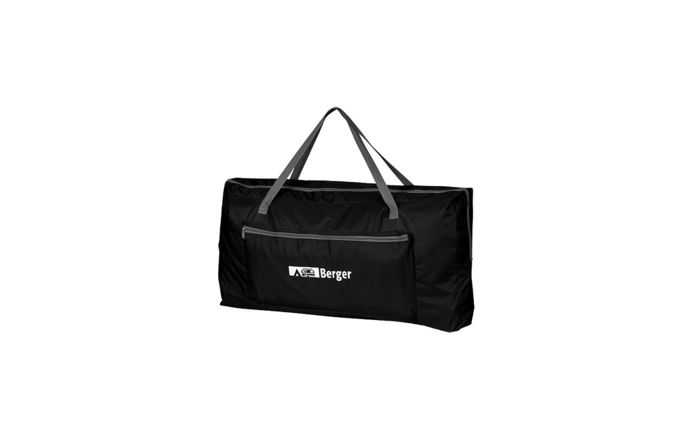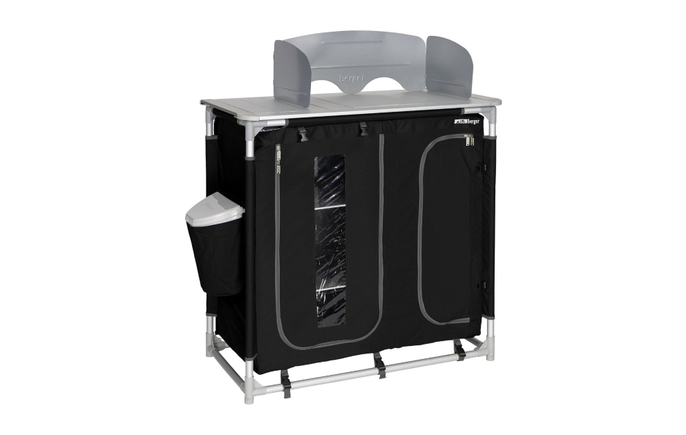 Berger Kitchen Box Premium II nudi puno prostora za pohranu pribora za kuhanje i namirnica zahvaljujući svojih 6 pretinaca za odlaganje. Mogu se otvoriti pomoću integriranog patentnog zatvarača tako da se mogu koristiti i za velike predmete. Rolo ploča i čvrsti okvir izrađeni su od laganog aluminija. Noge podesive po visini bez napora kompenziraju neravne podove. Poklopac je izdržljiv i robustan. Veći bočni pretinac može se koristiti kao držač za Berger kantu za otpad.