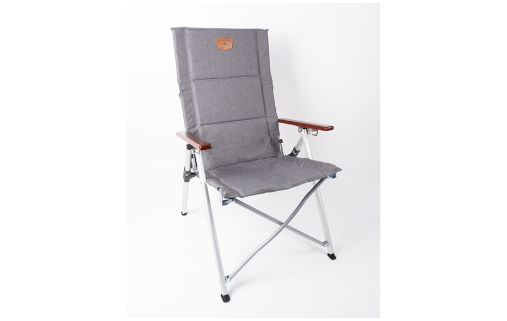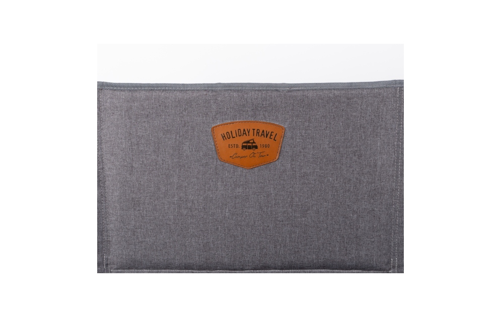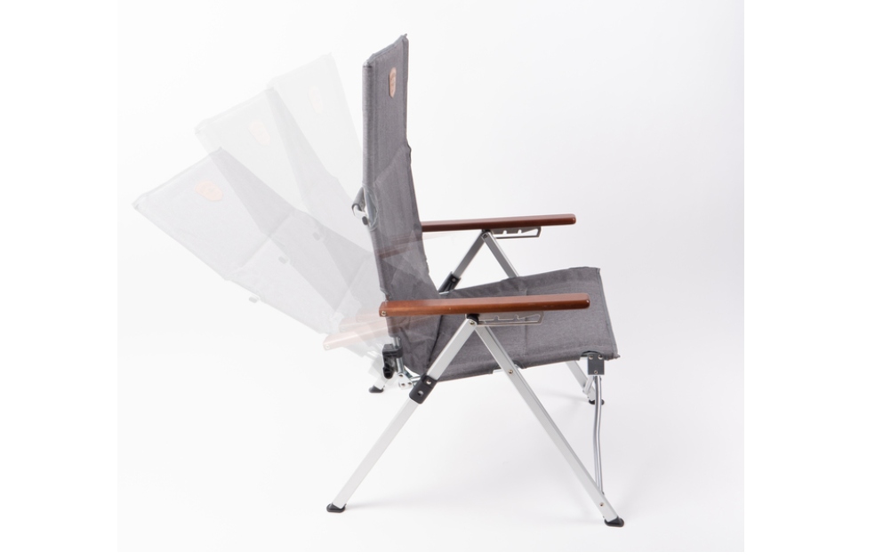 Trendi preklopna stolica JOPLIN LUXUS iz serije HOLIDAY TRAVEL s ekskluzivnom tkaninom sivih prošara, kožnom pločicom na naslonu i aluminijskim okvirom. Nasloni za ruke od tamnog pravog drveta. Naslon se može podesiti u 4 položaja, od ravnog do udobnog ležećeg položaja. Nosivost do 100 kg. S oblogom od 5 mm