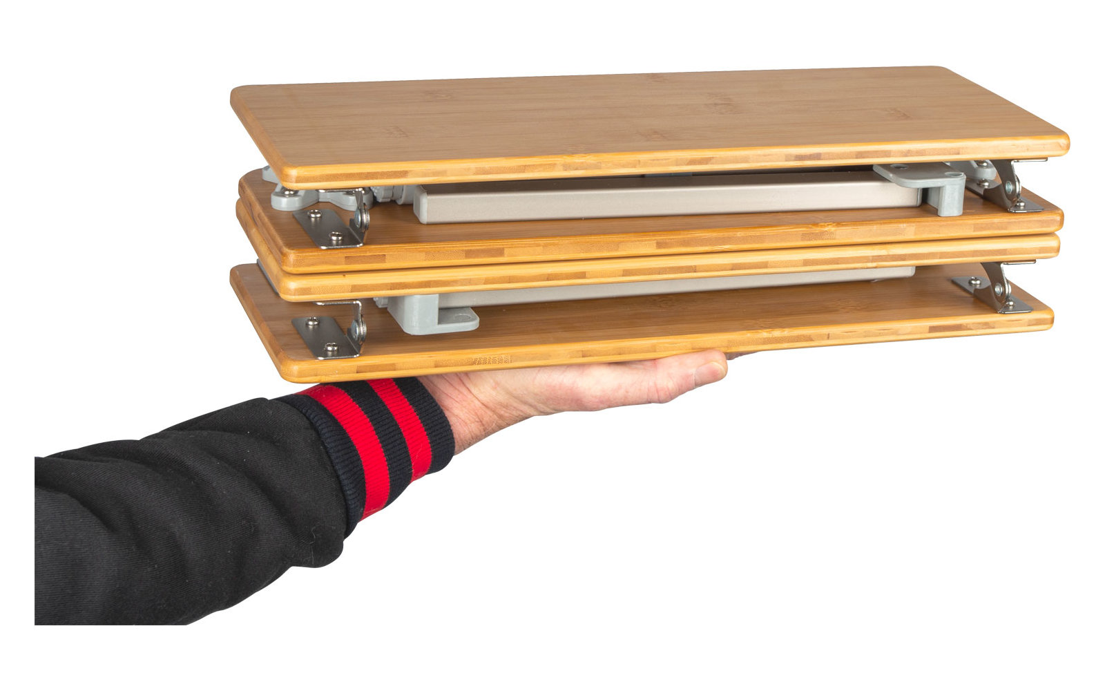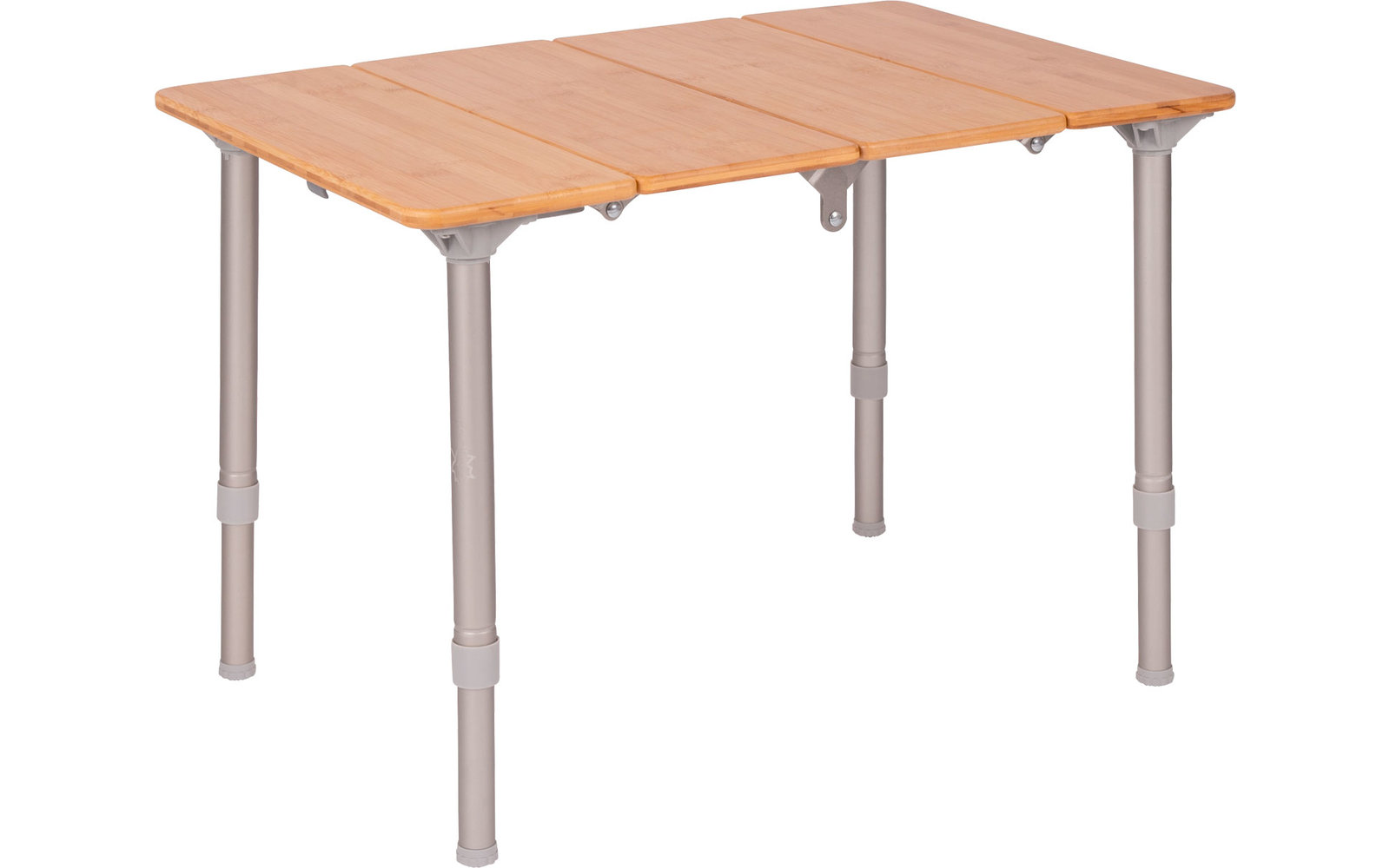 This waterproof table has a very sturdy aluminum frame with a thick bamboo table top. Has foldable legs and a divisible slat table top. By folding up the 4 slats of the table, the table can be folded up and transported compactly. The Air-Craft aluminum table legs are adjustable in height. Set up in seconds. Comes in a practical carrying bag.[:]