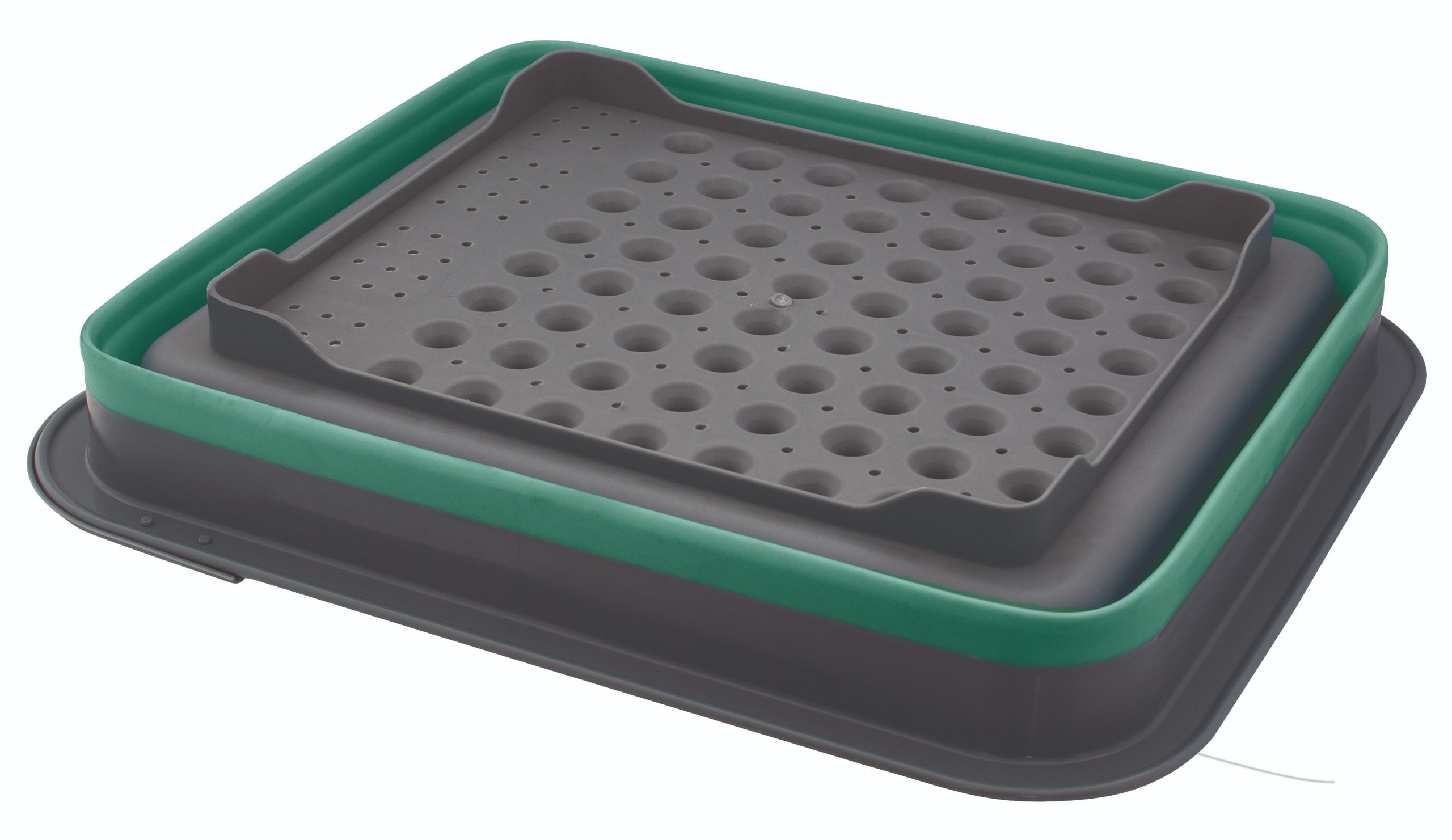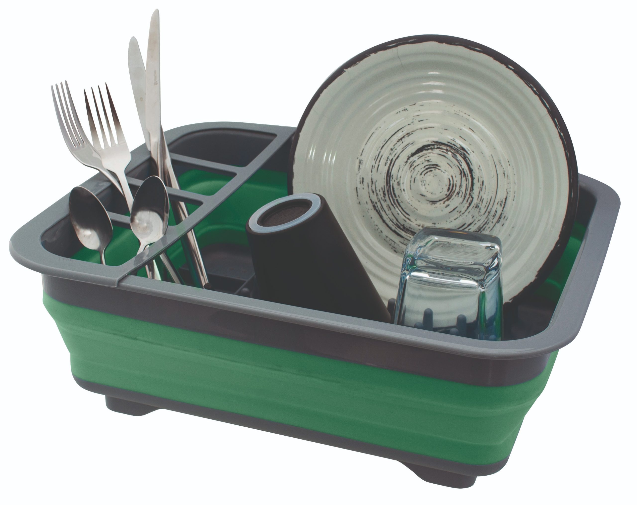 Lagani sklopivi stalak za suđe. Opremljen posebnim držačima tanjura protiv klizanja i pretincima za pribor za jelo. Stalak je lako sklopiv u ravni paket s malim volumenom pakiranja koji se može pohraniti bilo gdje.
