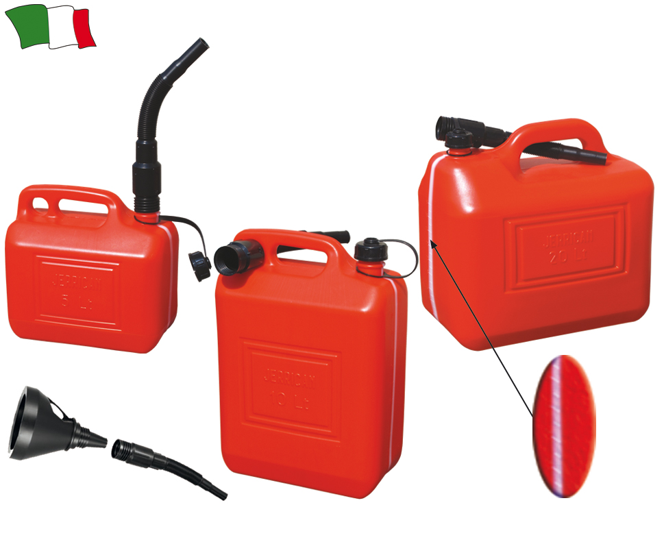 Spremnik za gorivo s mjernom razinom, opremljen prikladnim nepovratnim punilom, koji olakšava protok benzina u spremniku za gorivo. Idealno za transport ili skladištenje benzina ili drugih zapaljivih tekućina. UNI homologacija.