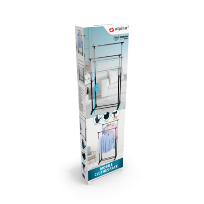 Dupli mobilni stalak za odjeću, uključuje kotače, lagan za prenošenje. Marka Alpina Dimenzije 1550x410x750mm Težina cca. 2.430 KG