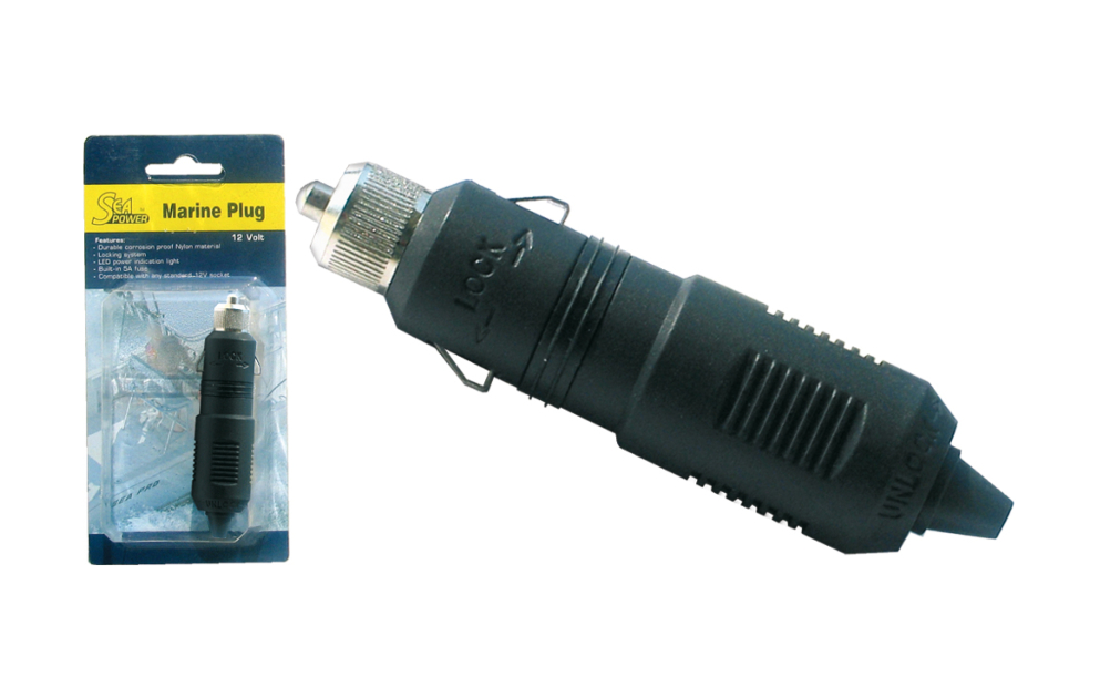 Utikač za nautičku uporabu s integriranim osiguračem 5A i svjetlećom LED diodom. Opremljen sustavom zaključavanja za sigurno pričvršćivanje utikača s utičnicom.
