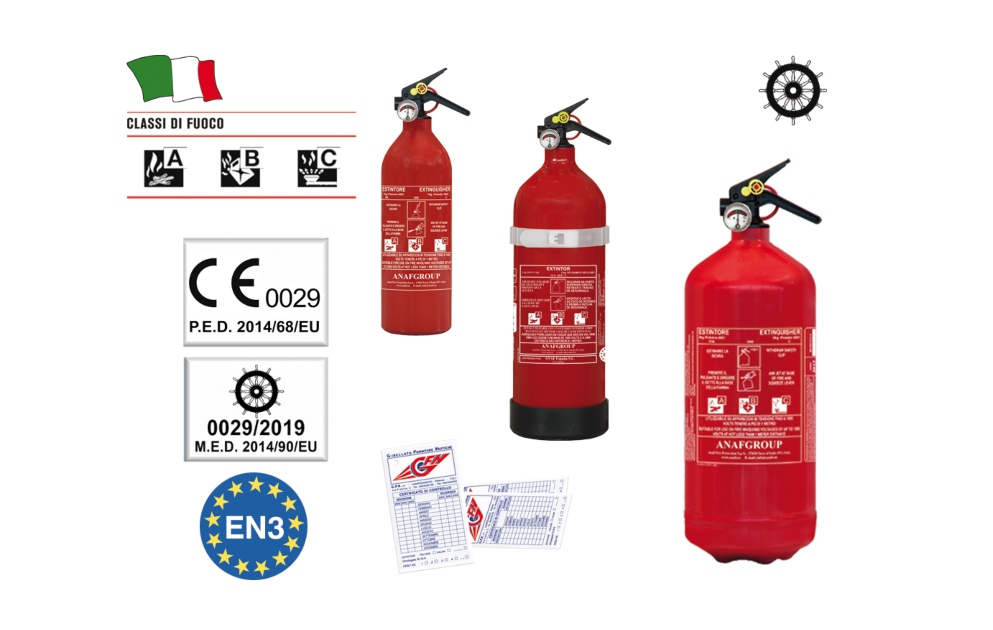 Aparat za gašenje požara s ventilom od acetalne smole za nautičku uporabu, pod tlakom u prahu, CERTIFICIRAN u skladu s MED 2014/90 / EU i PED 2014/68 / EU i homologiran od strane Ministarstva unutarnjih poslova prema pravilu EN3-7: 2004 s dvojezičnim talijanskim jezikom -engleska etiketa.