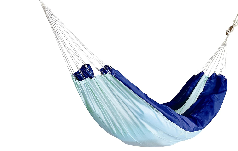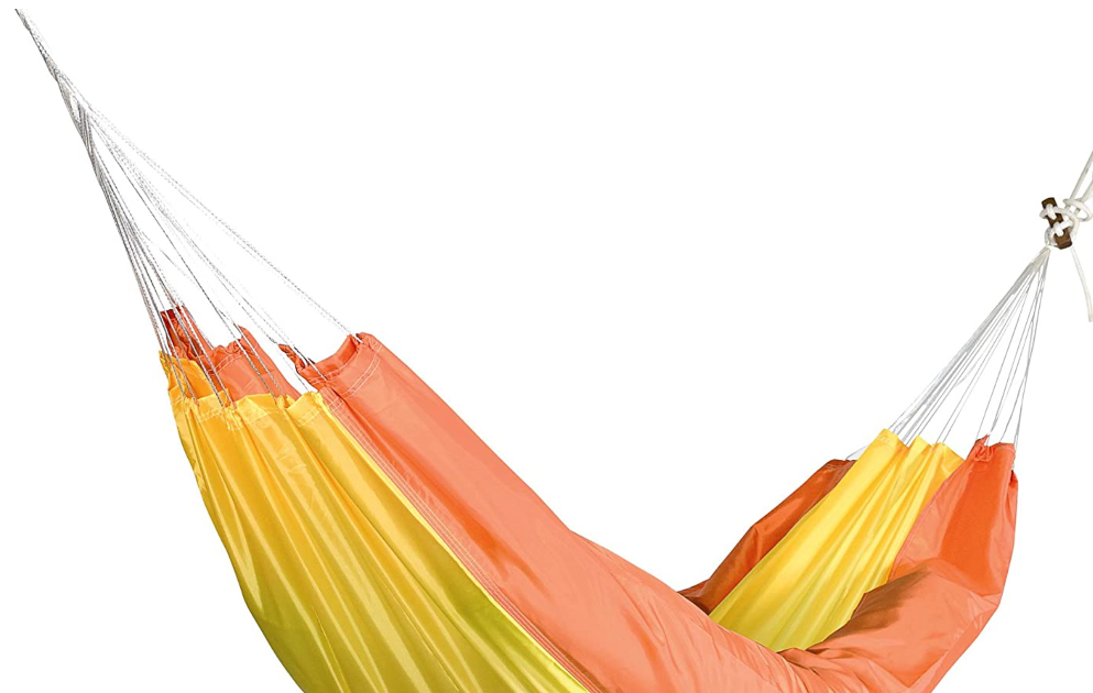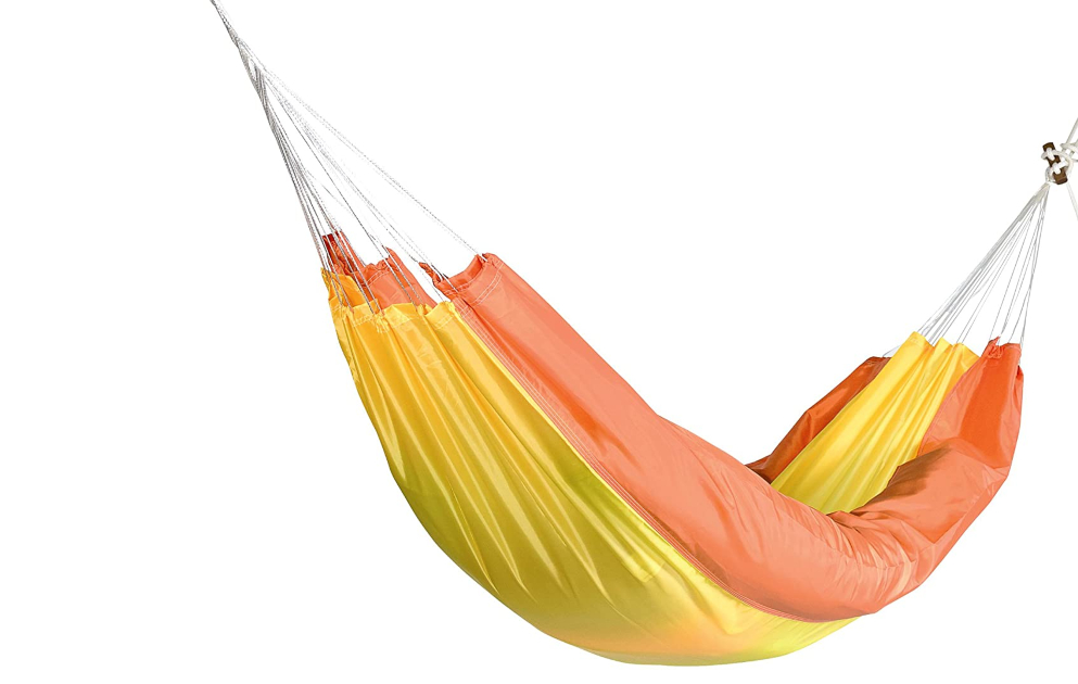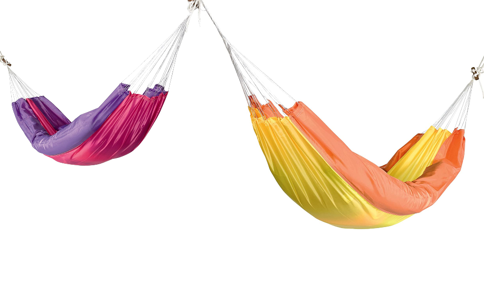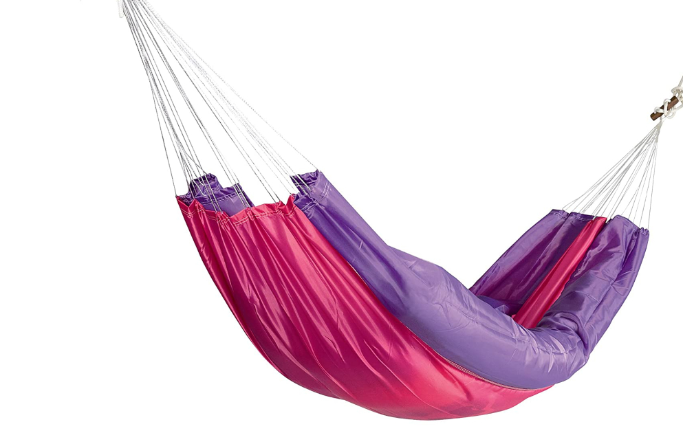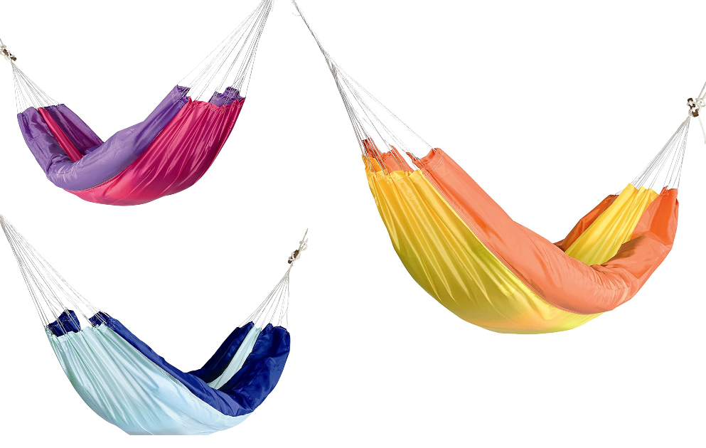 Viseća ležaljka dolazi u tri boje: narančasto žuta, ljubičasto roza i plava.