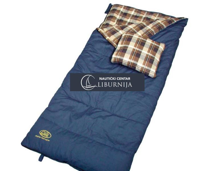 Pravokutna vreća za spavanje Camp Comfort 220X80cm s odvojivim jastukom. Vanjska boja je plava, unutarnja boja smeđa. Temperaturni rasponi: 8°C ugodno, 4°C granica, -11°C ekstremno. Materijal: Navlaka izvana: 35% pamuk / 65% poliester, unutrašnja presvlaka: pamučni flanel, nadjev: 960g/m² šuplja vlakna.