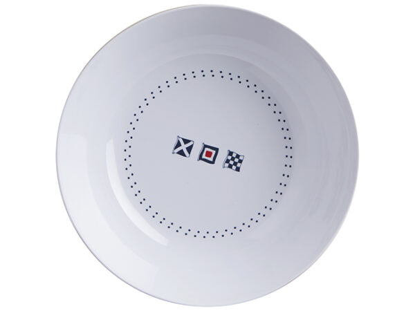 Lomljivo melaminsko posuđe s pomorskim prugama i zastavicama unosi svjetlost i šarenilo na vaš stol zahvaljujući dekoru s pomorskom tematikom.